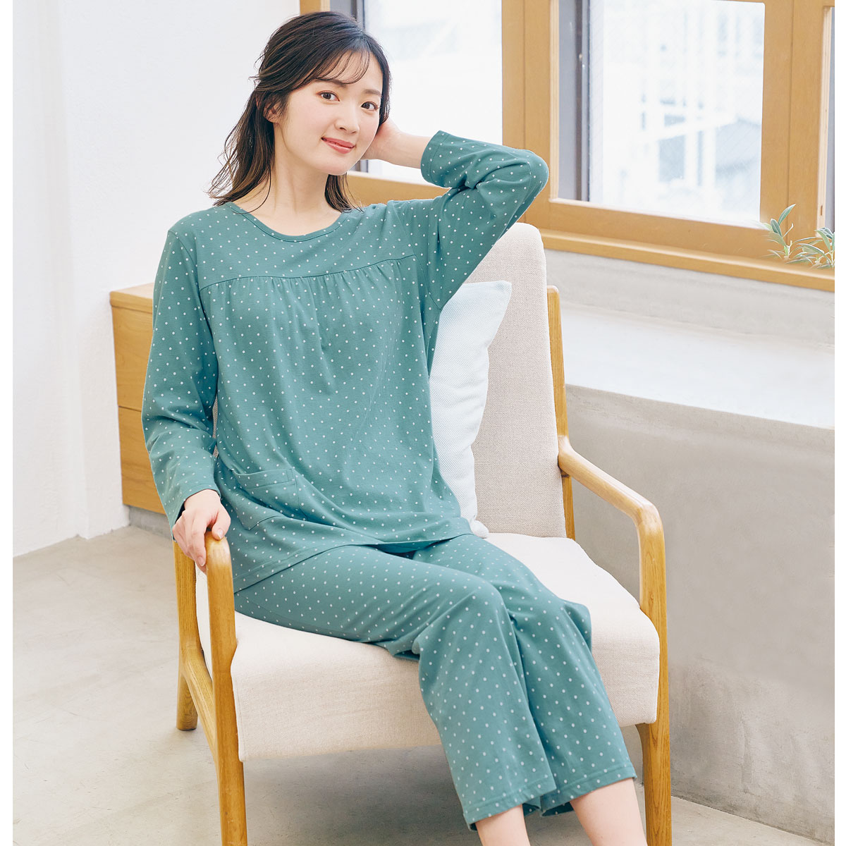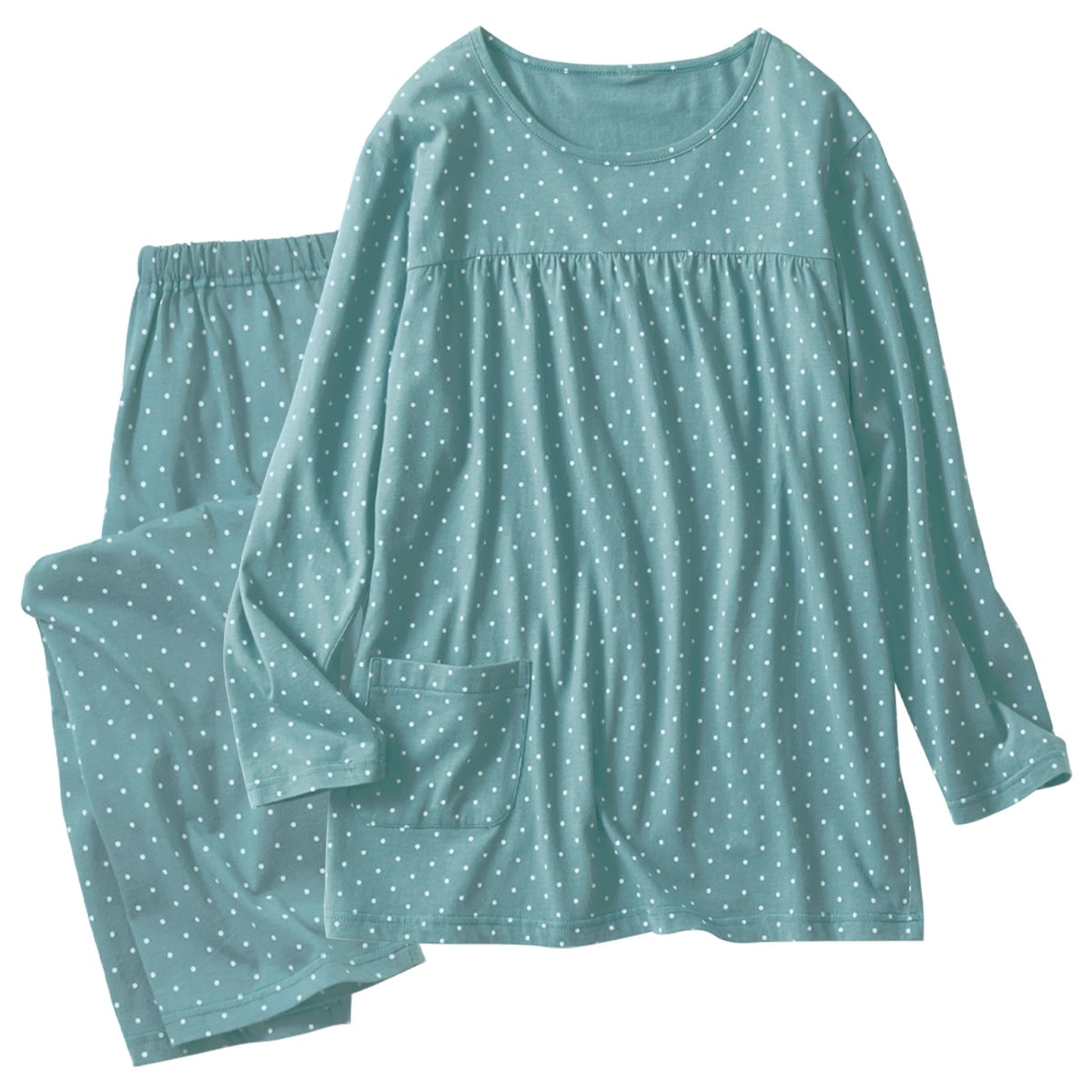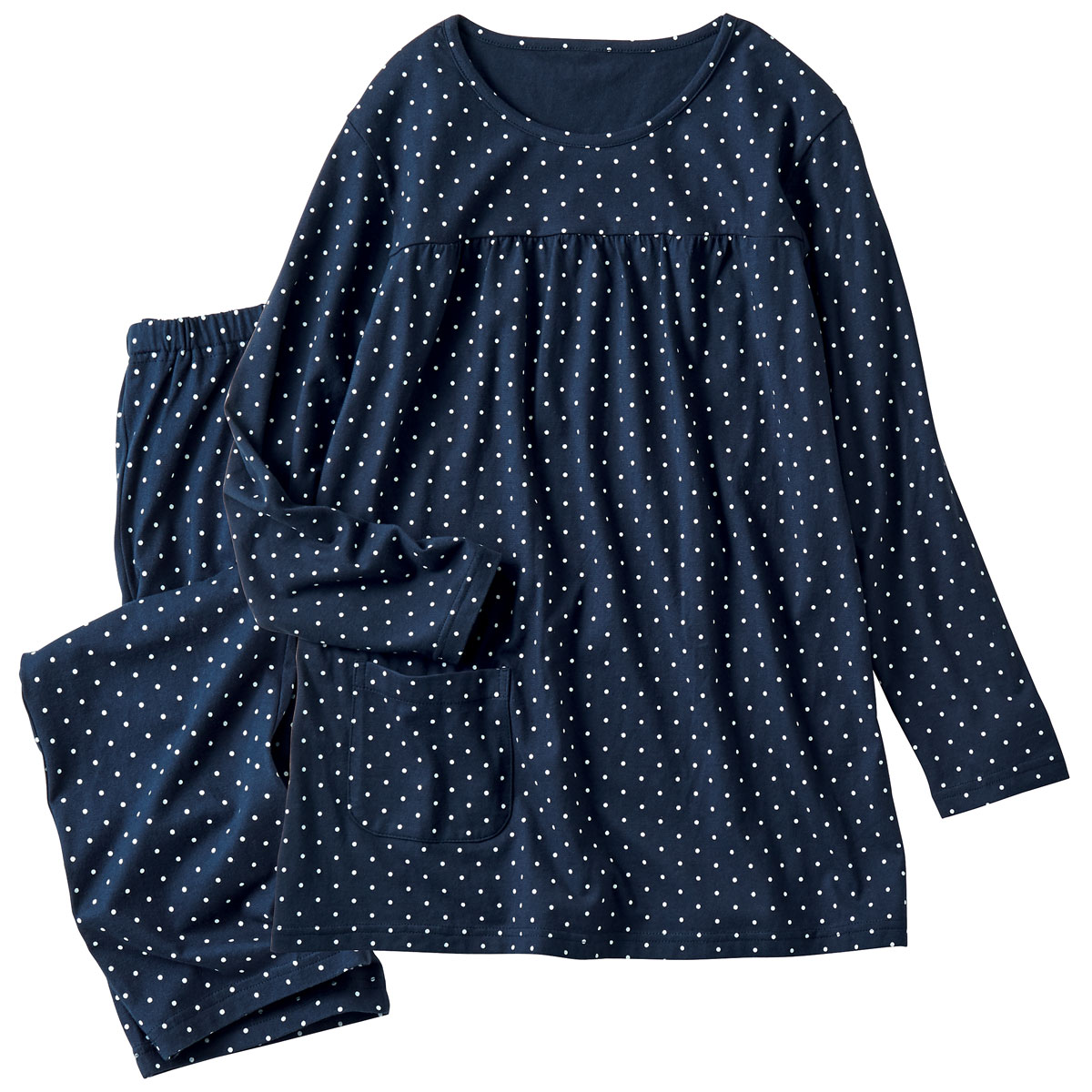 着やすいTタイプパジャマ! 胸元にギャザーを寄せたデザインと総ドット柄でガーリーな可愛いさに。ふわっとしたシルエットで、おなかまわりも楽ちん。型くずれしにくい綿100%天竺素材のやわらかな着心地もグッド。