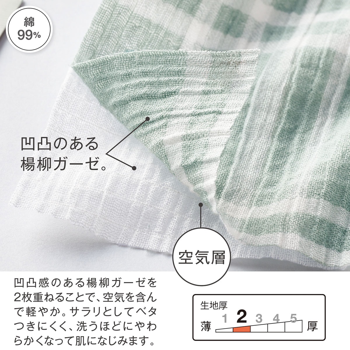 表面が凸凹していて、肌にはりつきにくいサマーガーゼ®素材の爽やかパジャマ。軽い着心地と涼しい肌ざわりがやみつきになる。