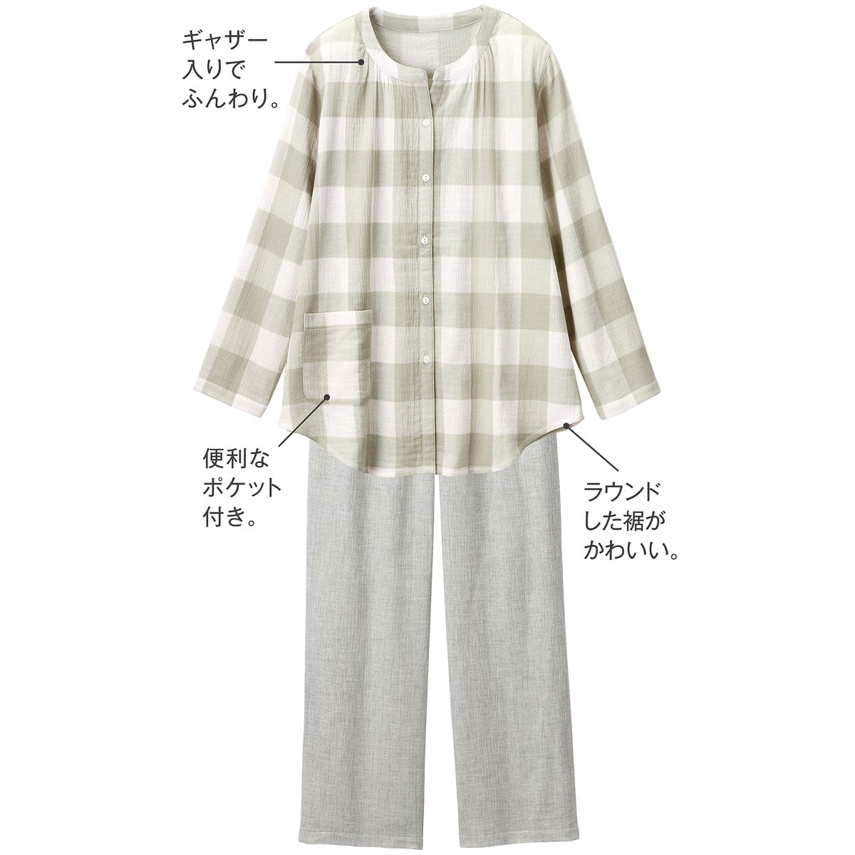 表面が凸凹していて、肌にはりつきにくいサマーガーゼ®素材の爽やかパジャマ。裾のラウンドカットとゆったりシルエットがかわいい前開きタイプ。長袖だからロングシーズン活躍します。軽い着心地と、独特の涼しいシャリ感、ガーゼの柔らかさがミックスした風合いがやみつきになりそう!柄トップスと無地パンツのコーディネートだから、パジャマとしてはもちろんルームウェアにもグッド。前開きだから、介護や入院時のパジャマとしてもおすすめです。