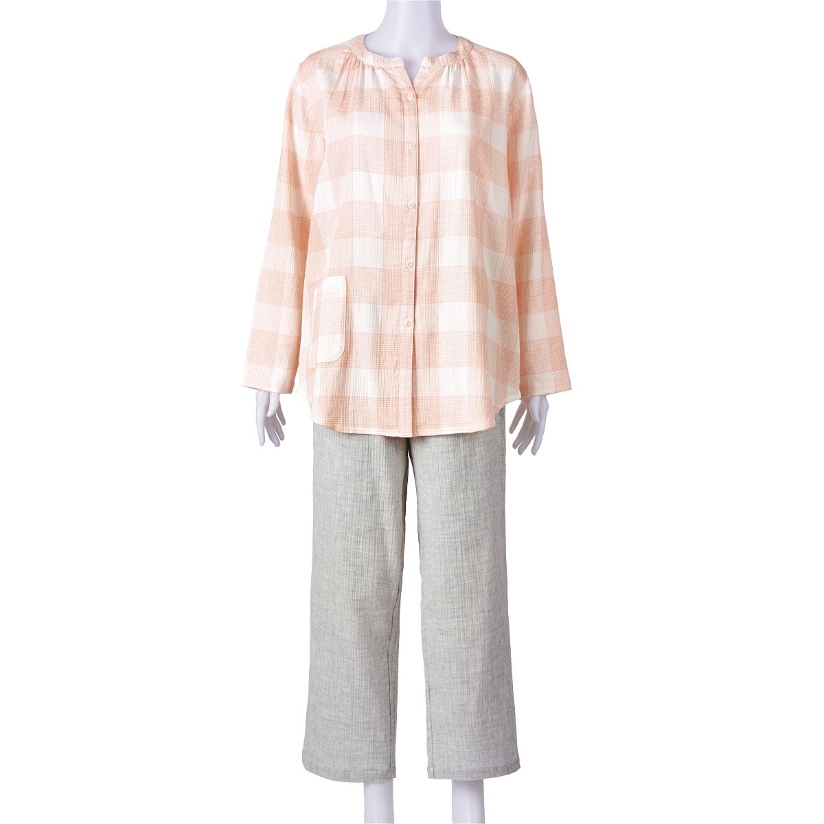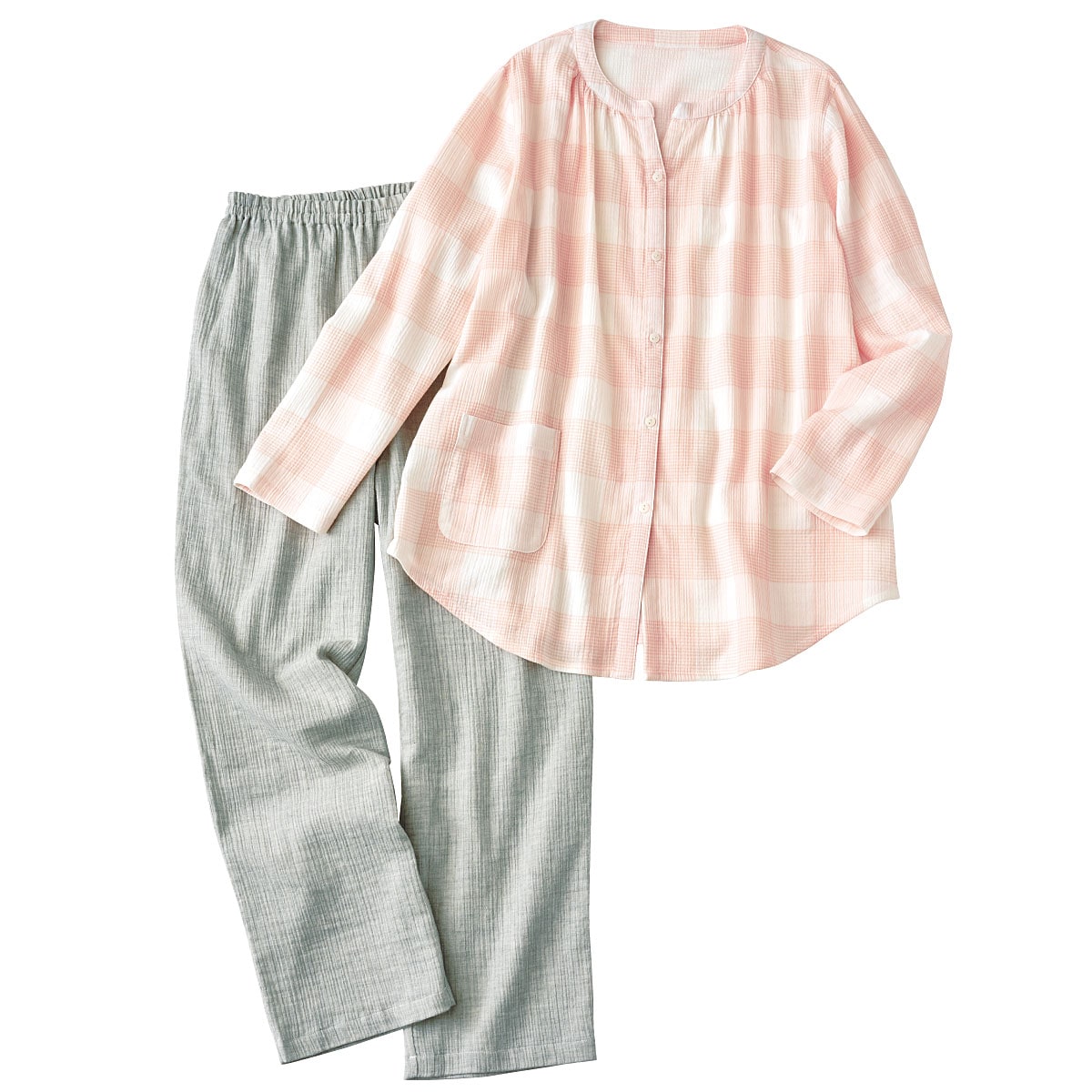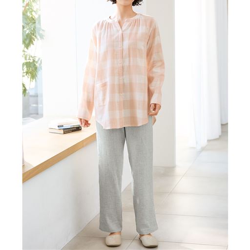 ■〔織物〕綿99%ポリウレタン1%(ガーゼ楊柳・先染)●上着=右前ポケット▼柄の位置は異なります●中国製【ウエストゴム取替OK】 【綿99%】 【大きいサイズも展開】(~5L)【生地厚指数2】※楊柳生地は洗濯後、横方向に縮みやすい特性がございます。縮んだ分はニット地のように横方向に伸縮するので、若干戻りますが、洗濯後干す際は形を整えてから干すことをおすすめいたします。