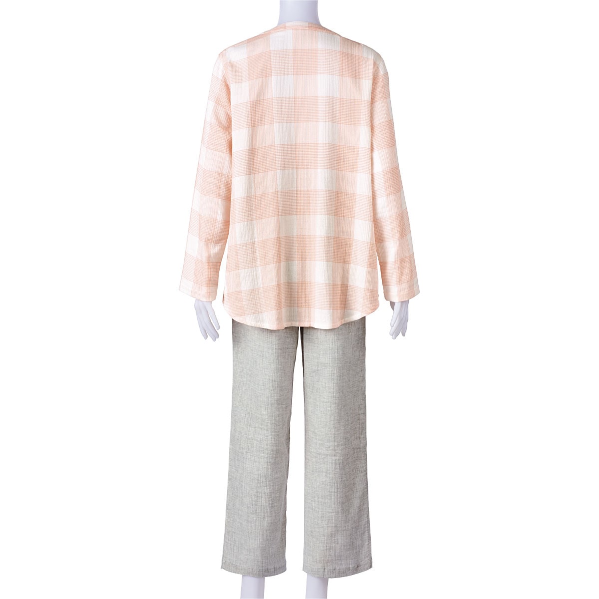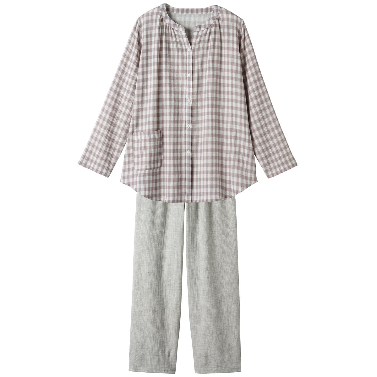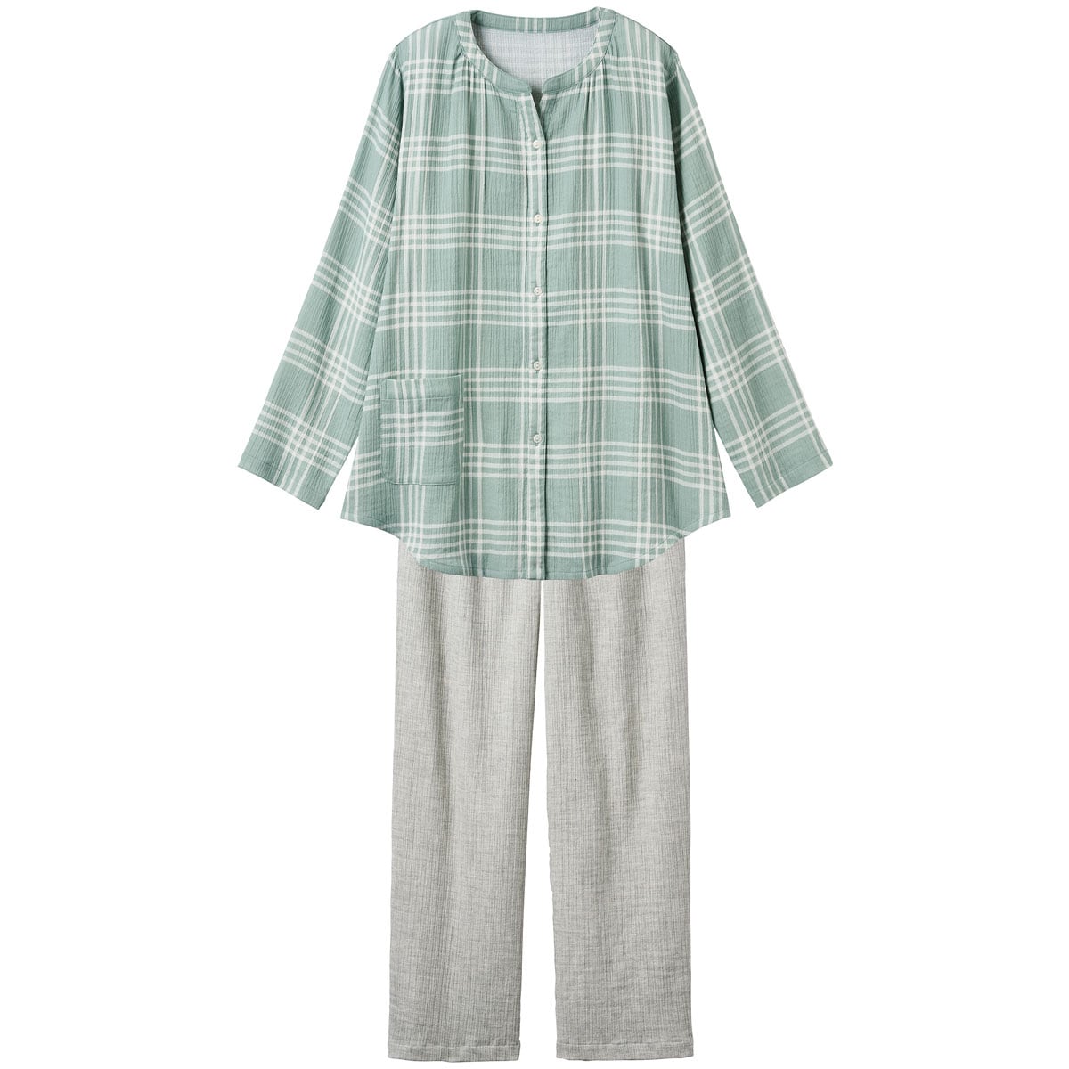 ■〔織物〕綿99%ポリウレタン1%(ガーゼ楊柳・先染)●上着=右前ポケット▼柄の位置は異なります●中国製【ウエストゴム取替OK】 【綿99%】 【大きいサイズも展開】(~5L)【生地厚指数2】※楊柳生地は洗濯後、横方向に縮みやすい特性がございます。縮んだ分はニット地のように横方向に伸縮するので、若干戻りますが、洗濯後干す際は形を整えてから干すことをおすすめいたします。