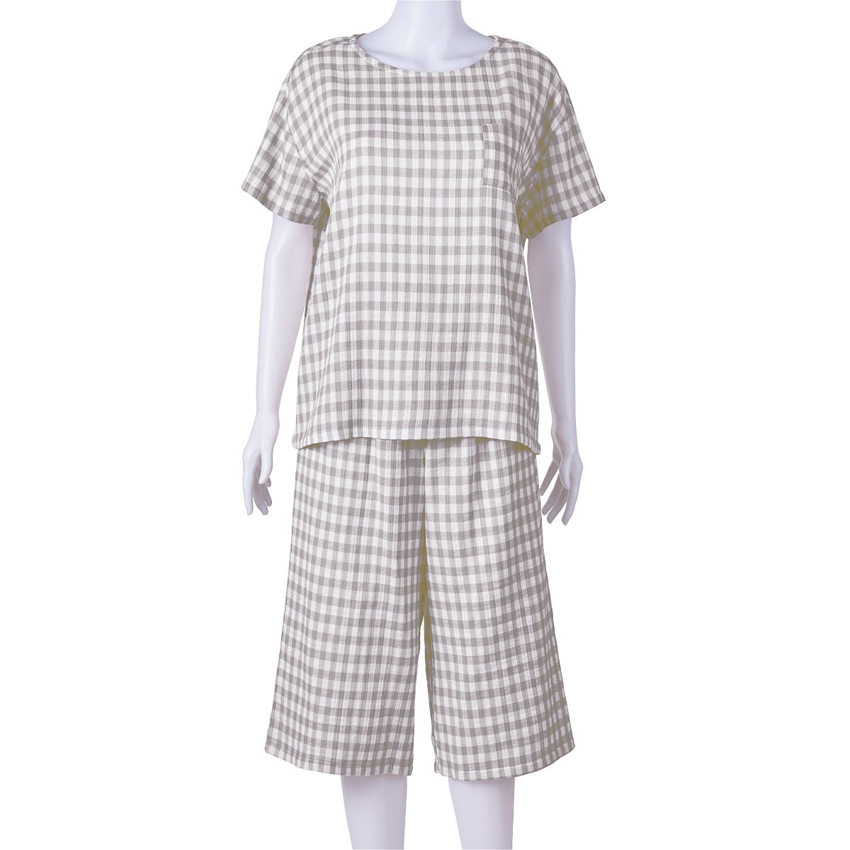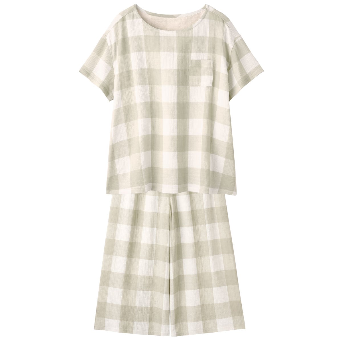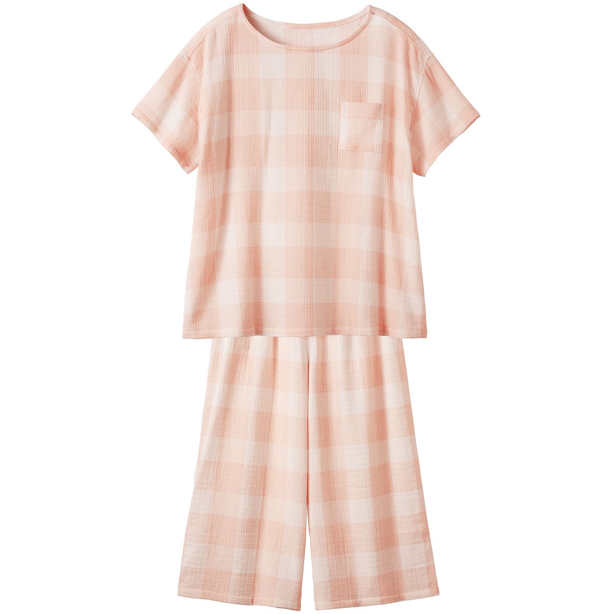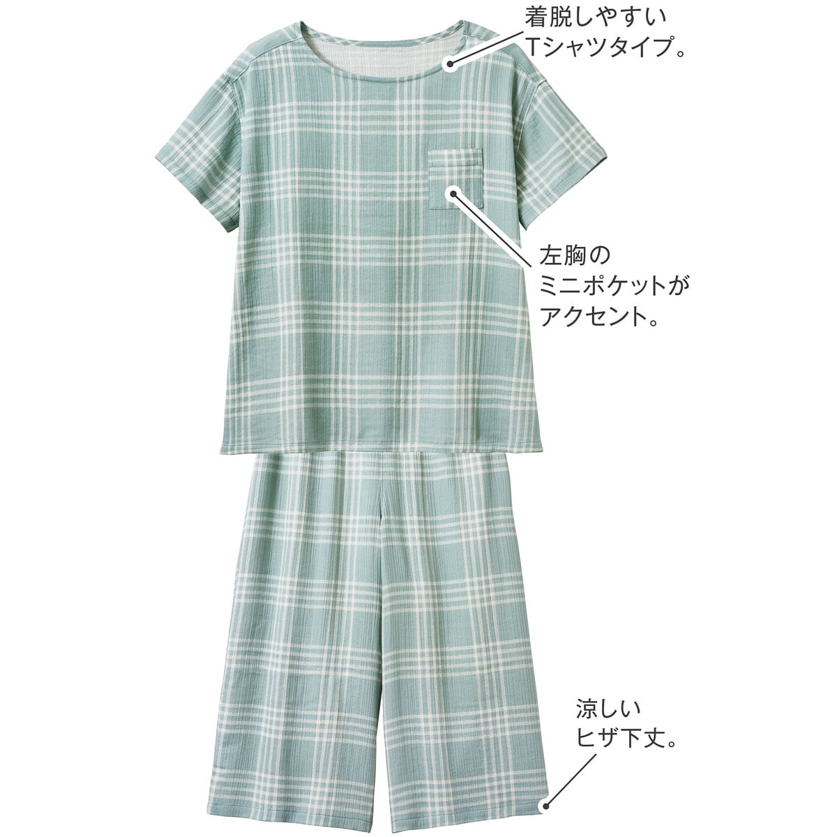 表面が凸凹していて、肌にはりつきにくいサマーガーゼ®素材の爽やかパジャマ。リラックス感のあるゆったりシルエットの半袖Tシャツタイプ。軽い着心地と、独特の涼しいシャリ感、ガーゼの柔らかさがミックスした風合いがやみつきになりそう!通気性にも優れているので、パジャマとしてはもちろんルームウェアとして1日中着ていたくなる快適さです。左胸のポケットがアクセントになったシンプルでかわいいデザイン。パンツは涼しいひざ下丈。大きいサイズ(5L)まで展開。