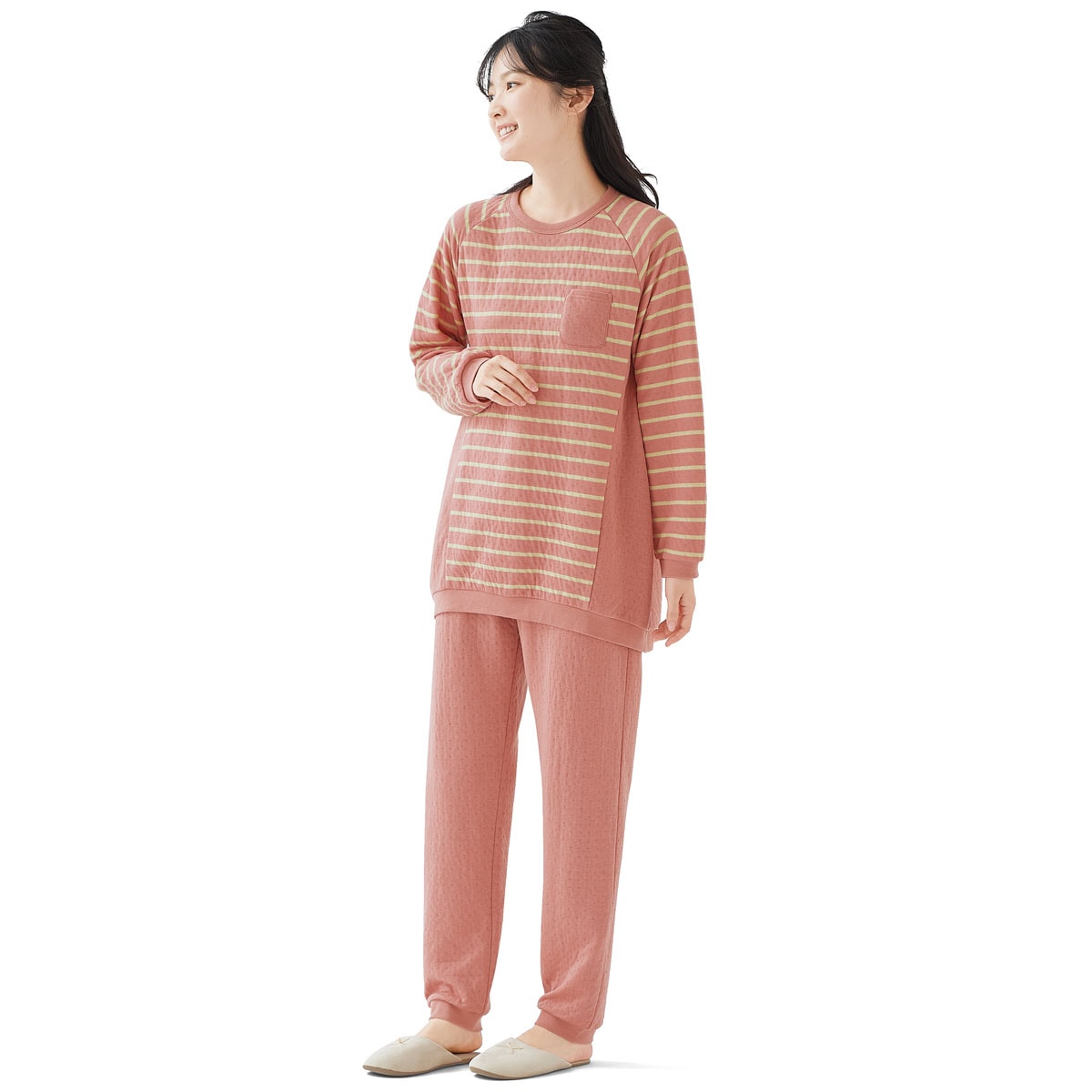 やさしい肌ざわりの綿100%ニットに、薄手の中わたをはさみ込んだニットキルトのあたたかいパジャマ。ほどよい厚みにぬくもりの空気層ができるから、あたたかさとやわらかさが両立。肌側は綿100%で肌へのやさしさにもこだわりました。腕がゆったり動かしやすいラグラン袖で、リラックスできる着心地。ボーダー柄と無地の切り替えや、腰回りをふんわりカバーする後ろ裾長めのコクーンシルエットで、ルームウェアにもOKのおしゃれっぽさに仕上げました。ウエストはゴム&ひも仕様です。大きいサイズも展開(M~5L)