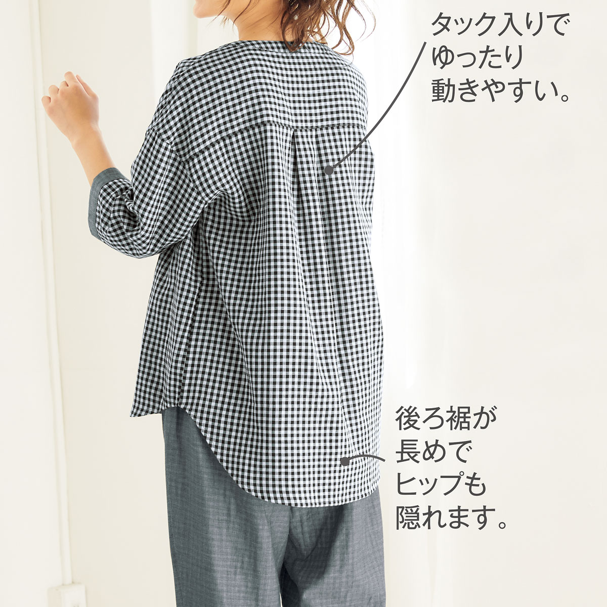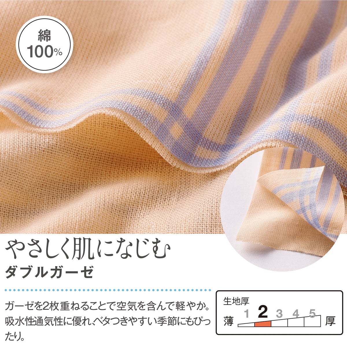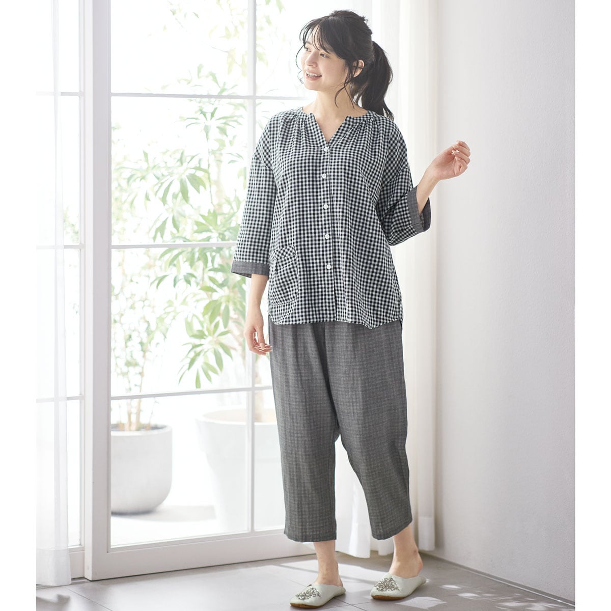 ふんわりやわらかな綿100%ダブルガーゼのゆったりパジャマ。コットンガーゼを2枚重ねることで、空気を含んで軽やか。吸水性・通気性にも優れ、夏も快適です。トップスは首元がラクなスキッパー衿で便利なポケット付き。ヒップをカバーする後ろ丈長めで、7分袖の袖口を裏地で切り替えたおしゃれなデザイン。パンツはヒップまわりゆったりのサルエル型で、リラックスしながらこなれ感も演出。チェック柄やストライプ柄と無地を組み合わせた飽きのこないデザインはルームウェアにも◎。ウエストゴム取替えOK。大きいサイズ(5L)まで展開。