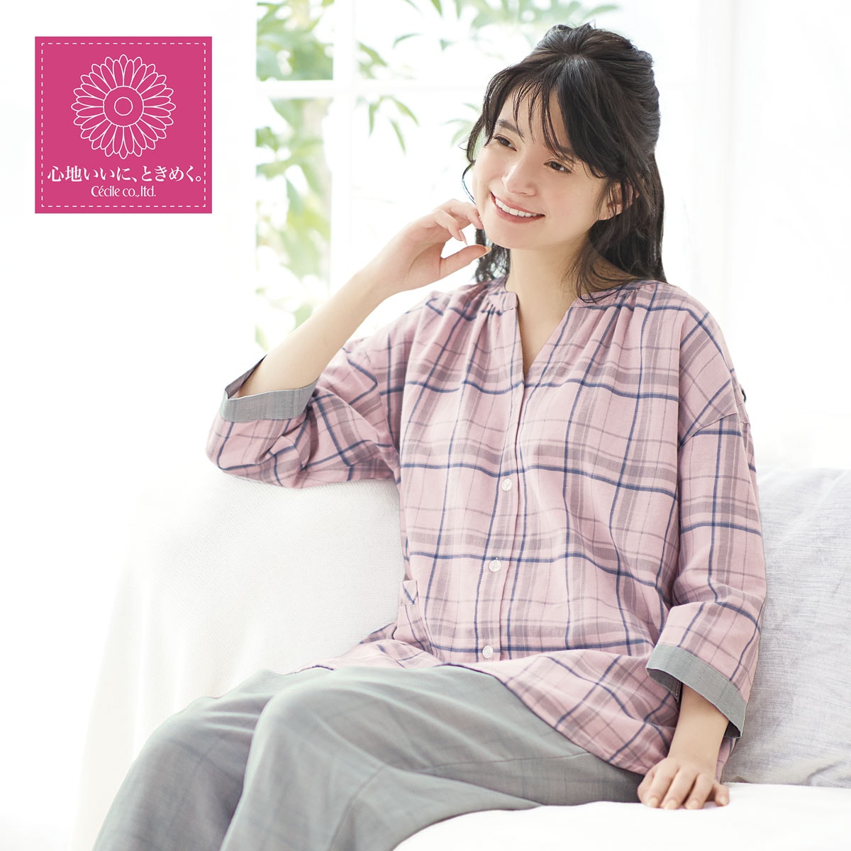 ふんわり軽やかなコットンの2重ガーゼに包まれる幸せ。お部屋でそのままのんびり過ごせるこなれデザイン♪ 介護、入院時のパジャマとしてもおすすめです。