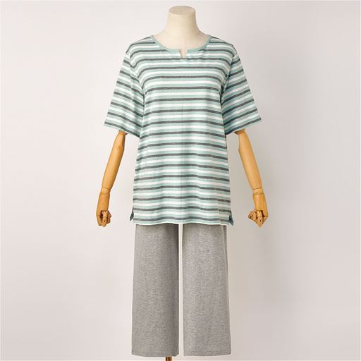 ■〔ニット〕綿100%(天竺)●上着=両脇スリット(約7cm)▼ボーダーピッチは商品のカラーによって異なります▼柄の位置は異なります●ミャンマー製、中国製【綿100%】 【ウエストゴム取替OK】 【大きいサイズも展開】(M~5L)【生地厚指数1】(透け感あり)