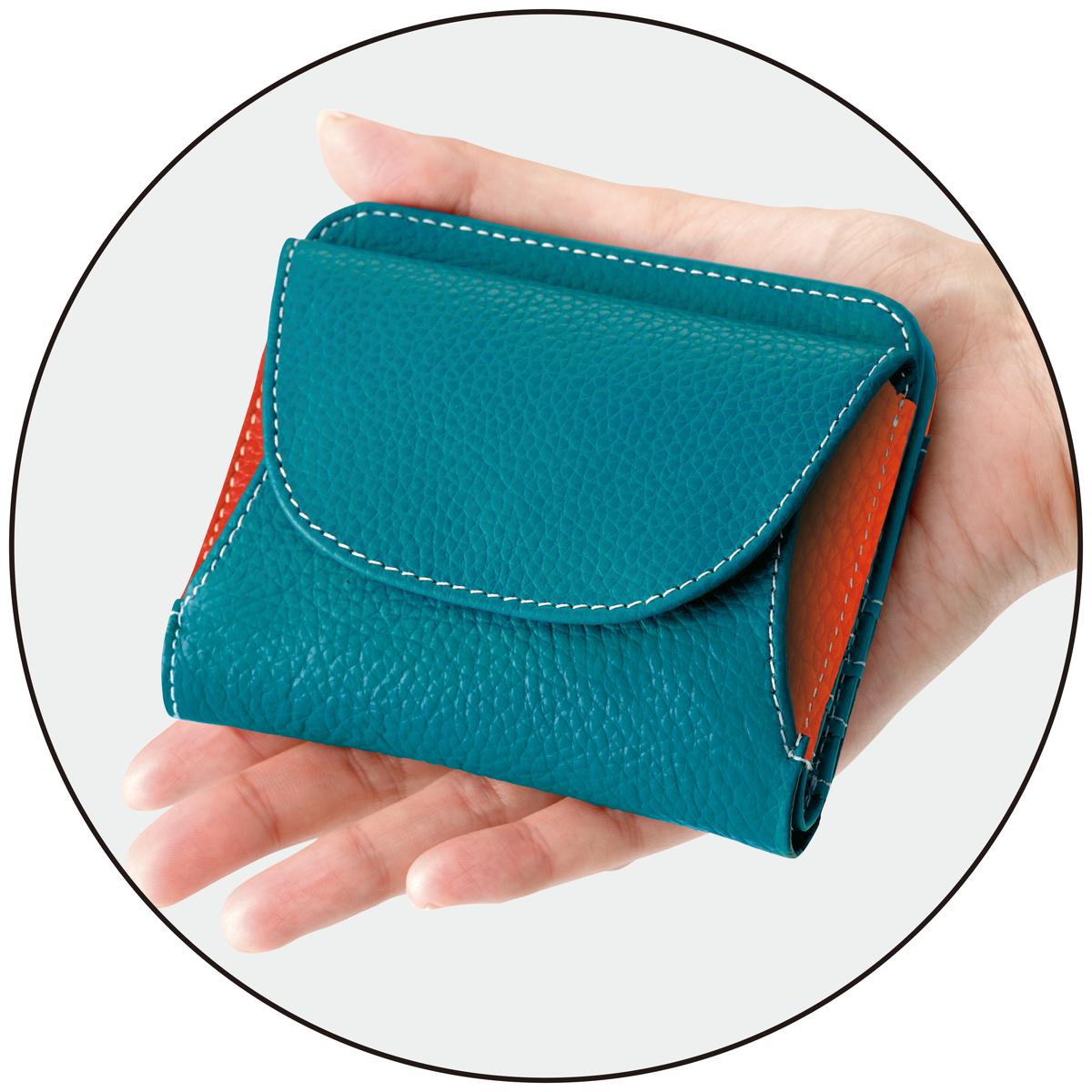 カードは6枚、お札は2カ所に収納可能。大きく開いて、小銭が見やすく出し入れもラク。ーデザインー小ぶりなサイズながら、きちんと収まる無駄のない設計。配色使いがおしゃれなデザインもポイント。ー素材特徴ー傷が目立ちにくいシボ入り牛革製です。