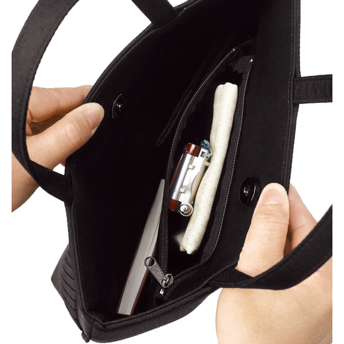 • 自立しやすいフォーマルサブバッグ。本体生地には撥水加工を施しています。