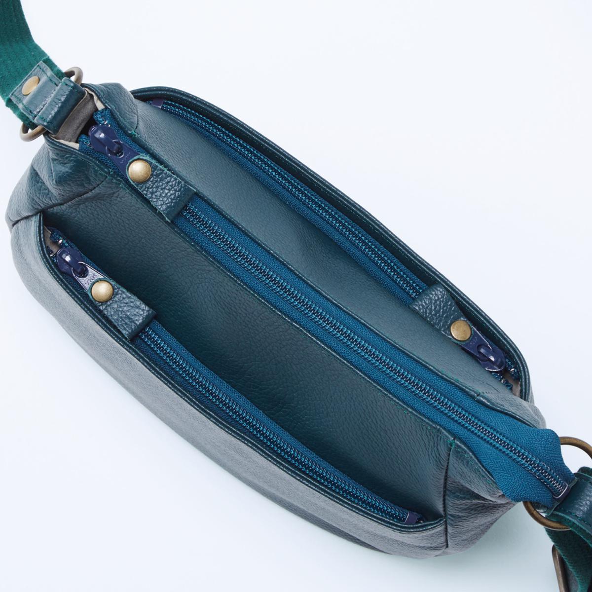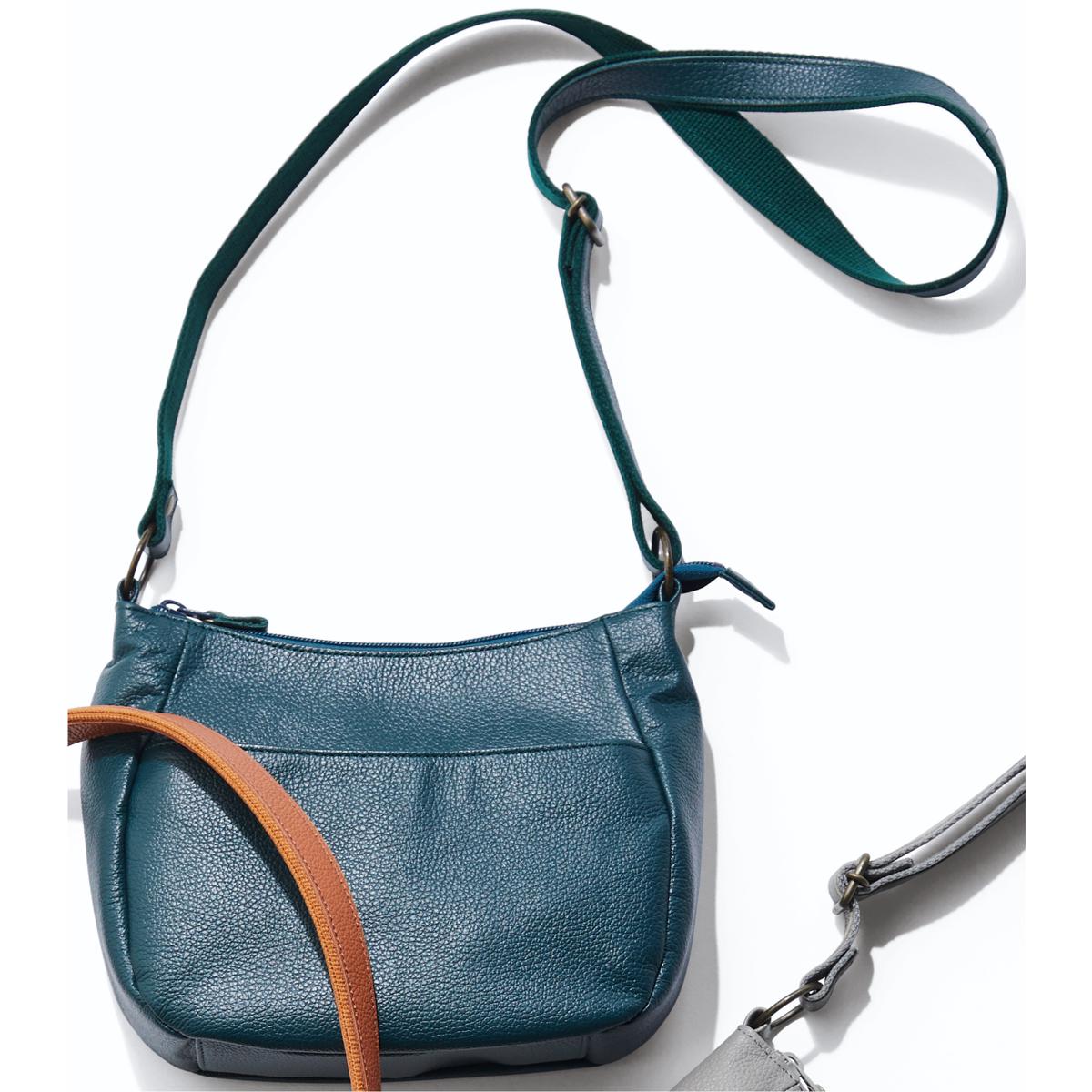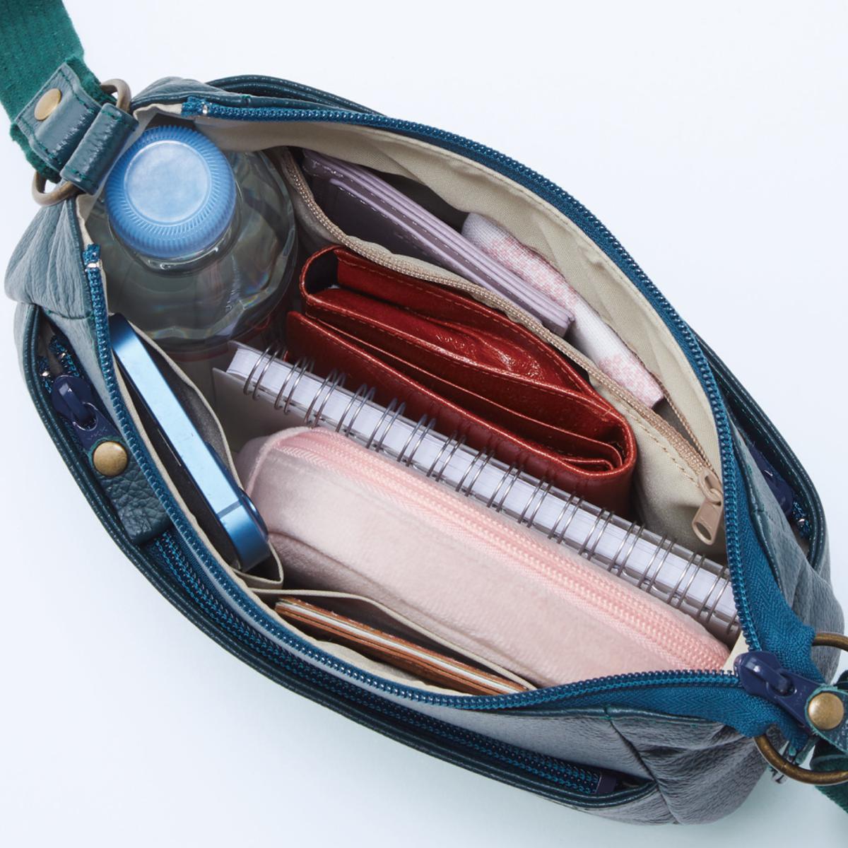 ころんと丸いフォルムで小ぶりながら、ポケットが多く整頓できるのが嬉しい。ーデザインー長めのファスナー使いで全開にすると収納した物が見やすい。5つのポケットで、持ち物を外・内ポケットに細かく分けて収納可能。ー素材特性ー柔らかで上質な風合いの牛革です。はっ水加工で多少の雨でも安心。水や汚れが付着しにくく快適です。