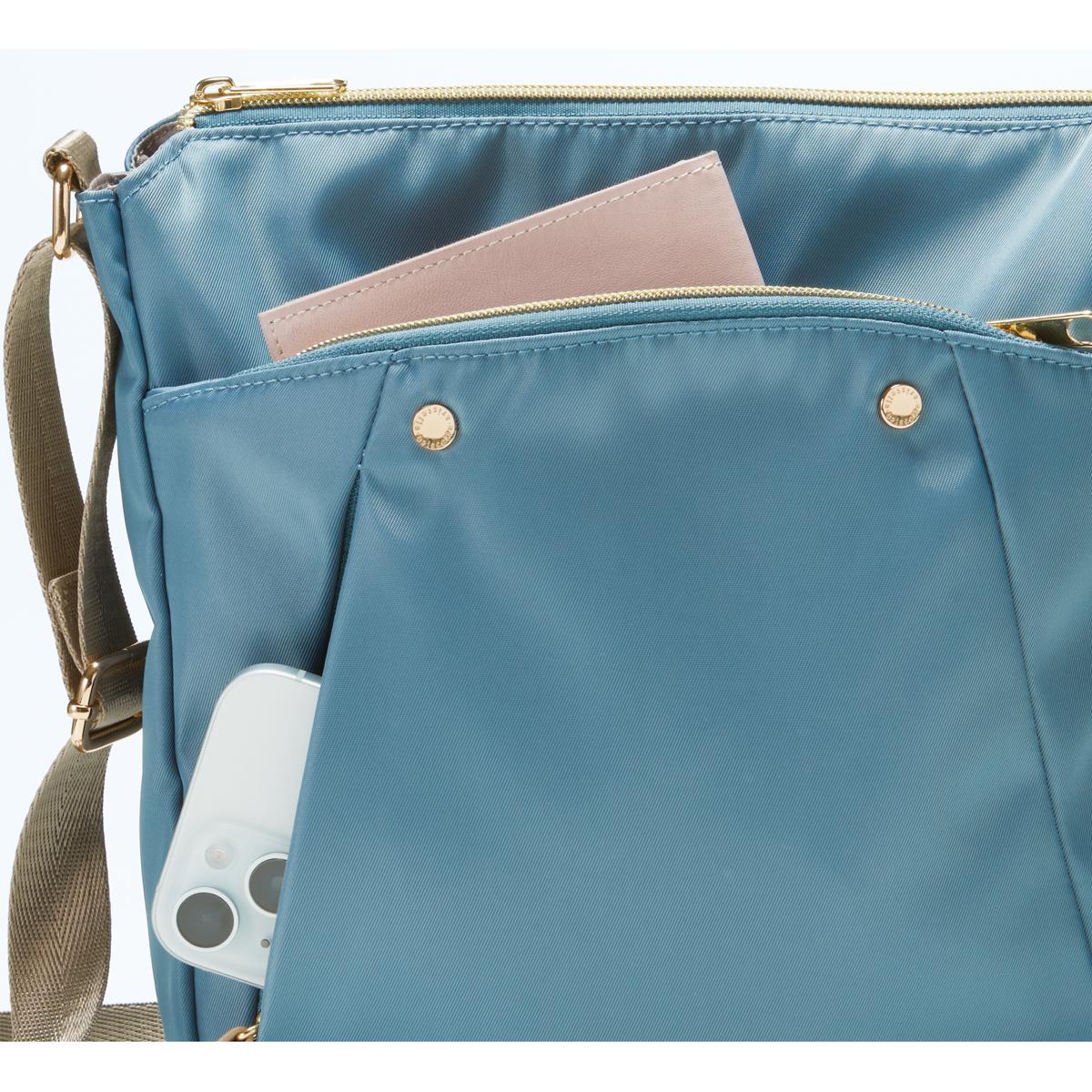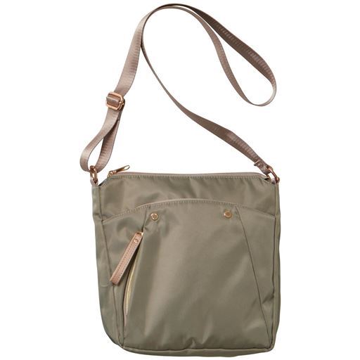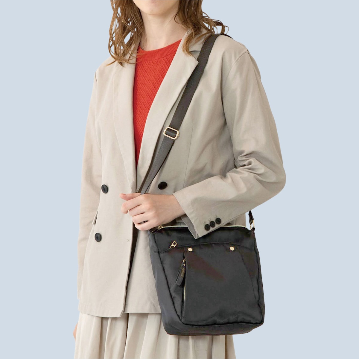 約200gでとにかく軽いのがうれしい!ショルダーバッグ。小分けに収納できて、必要なものをサッと取り出せます。ーデザインートレンドの縦型デザイン。前面は、スマホなどを出し入れしやすいサイドファスナー付き。折りたたみ傘や500mLのペットボトルを縦に収納できます。