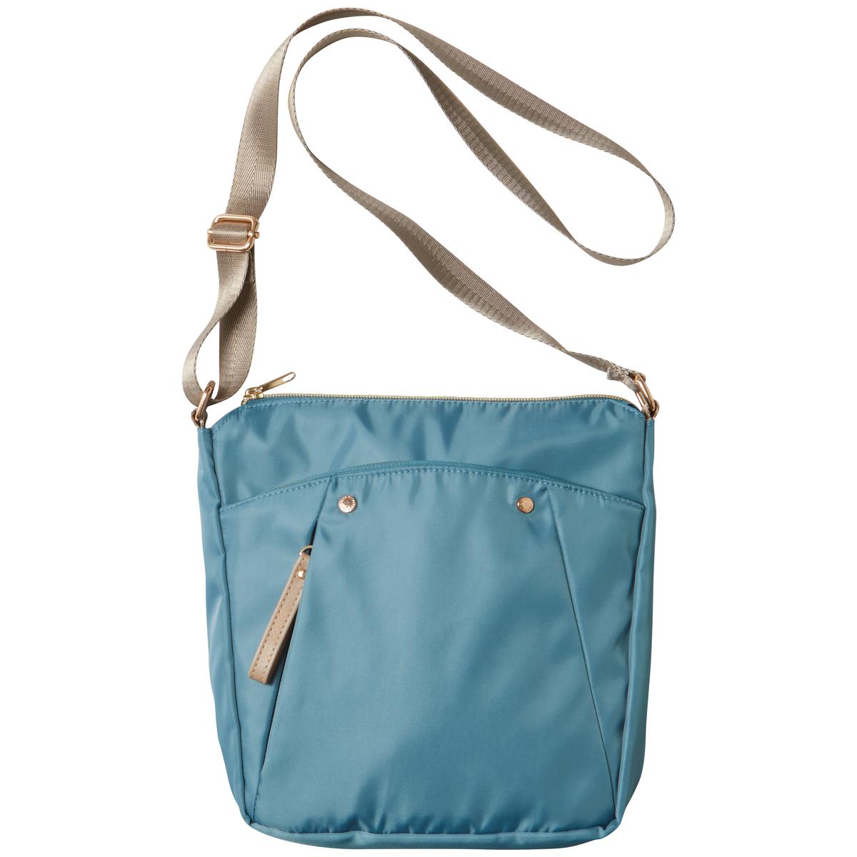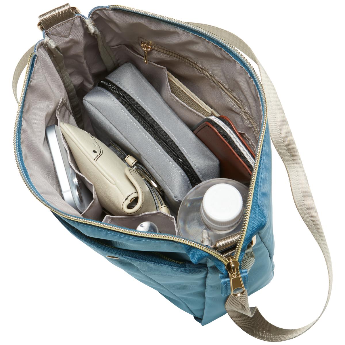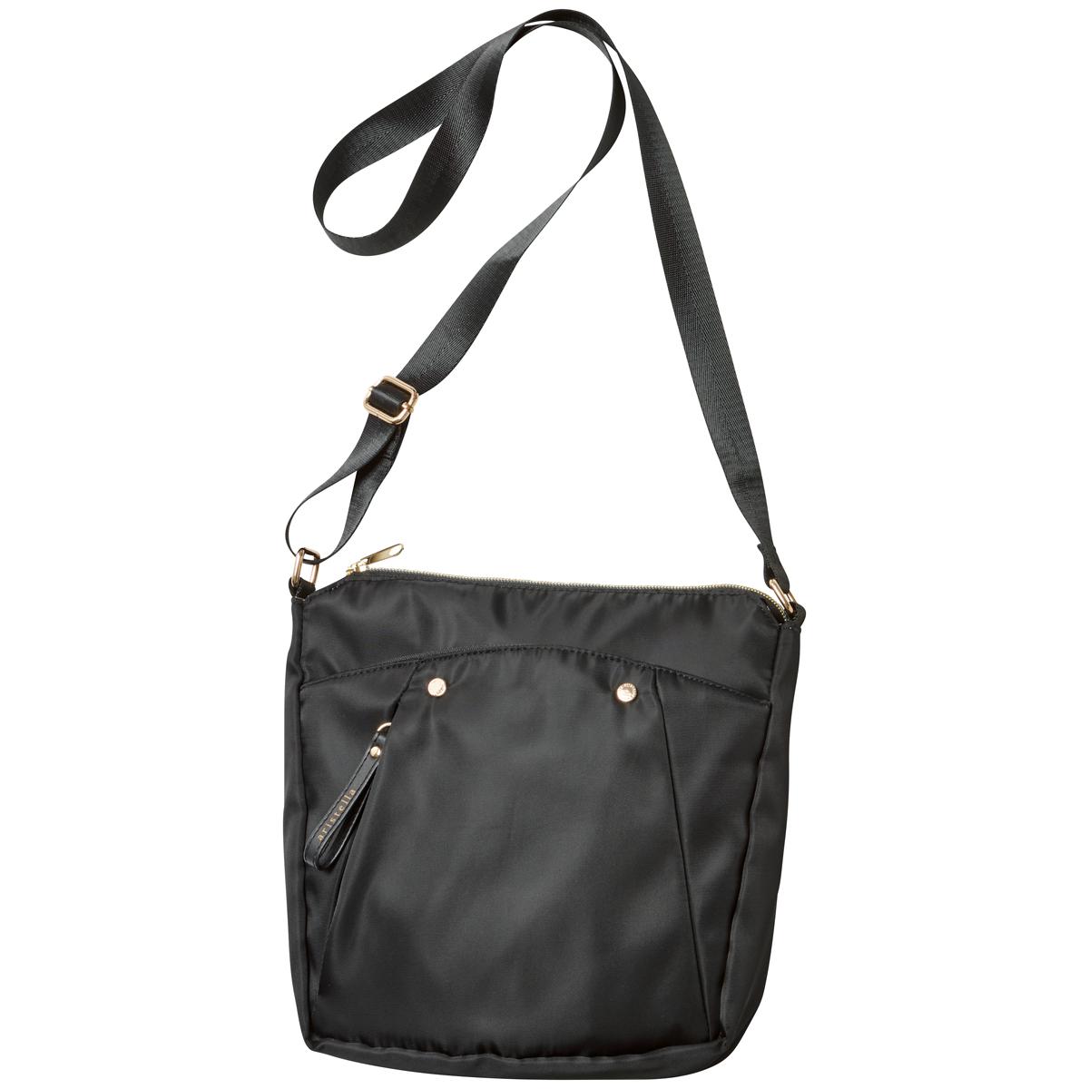 約200gでとにかく軽いのがうれしい!ショルダーバッグ。小分けに収納できて、必要なものをサッと取り出せます。ーデザインートレンドの縦型デザイン。前面は、スマホなどを出し入れしやすいサイドファスナー付き。折りたたみ傘や500mLのペットボトルを縦に収納できます。