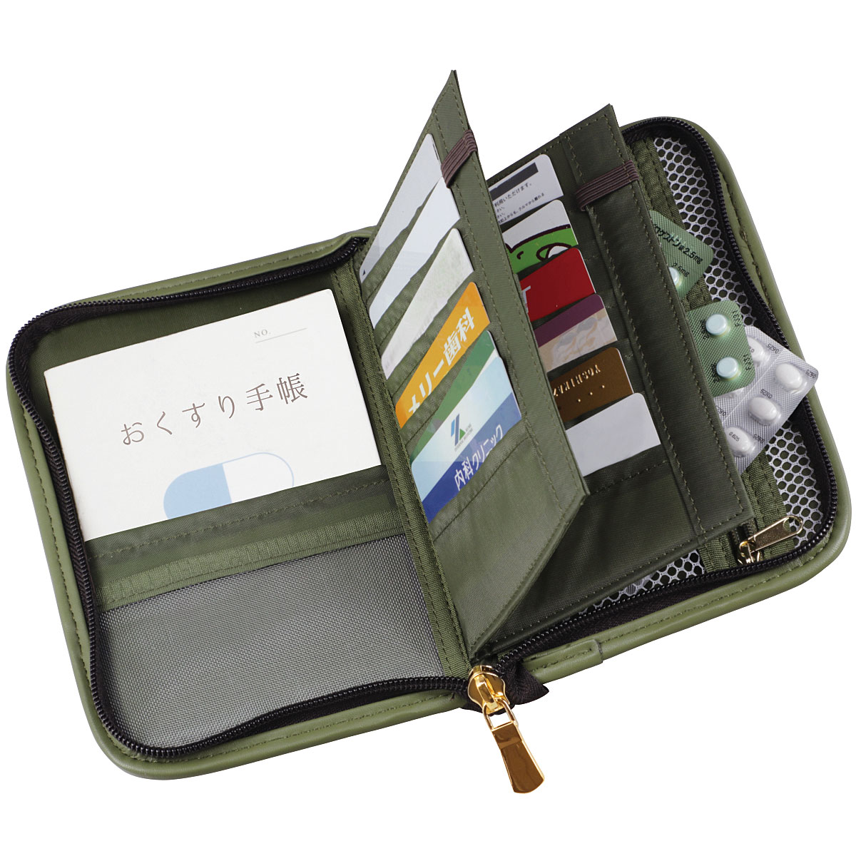 -お買い得ポイント-あれっどこに入れたっけ?病院で必要なあれこれがこれ一つに収納。もう忘れて困ることもありません。-デザイン-大きなポケットにはお薬手帳、小さいポケットには診察券、メッシュのところにはお薬。開閉はファスナーなので、落とす心配なし。たっぷり入るのがうれしい。-素材特徴-合成皮革なので、特別なお手入れは不要です。