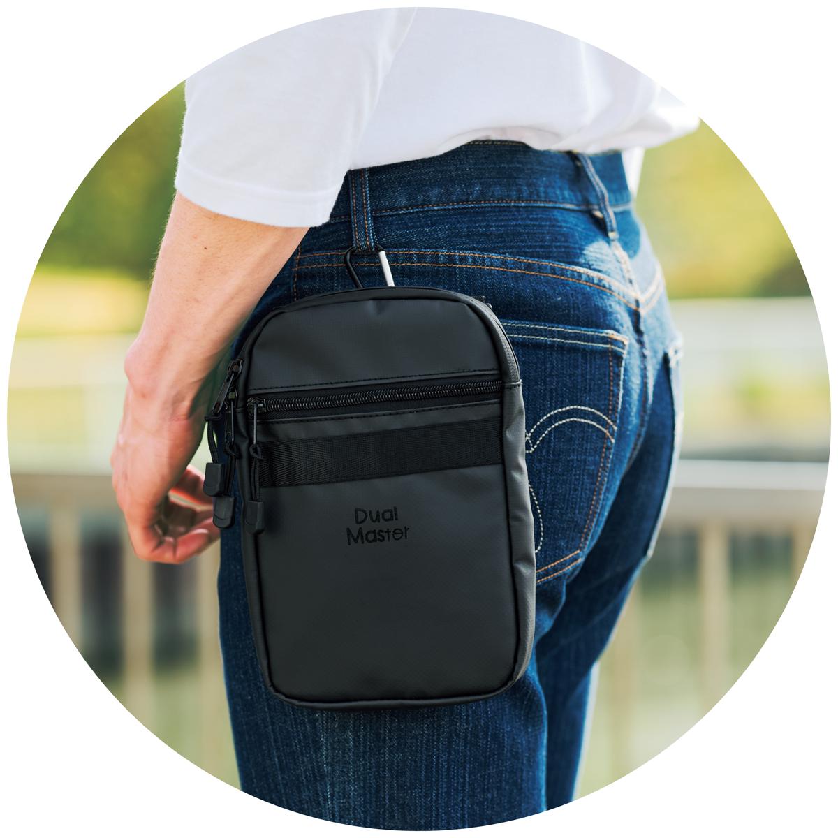 カラビナをパンツのループに装着してウエストバッグにしても。