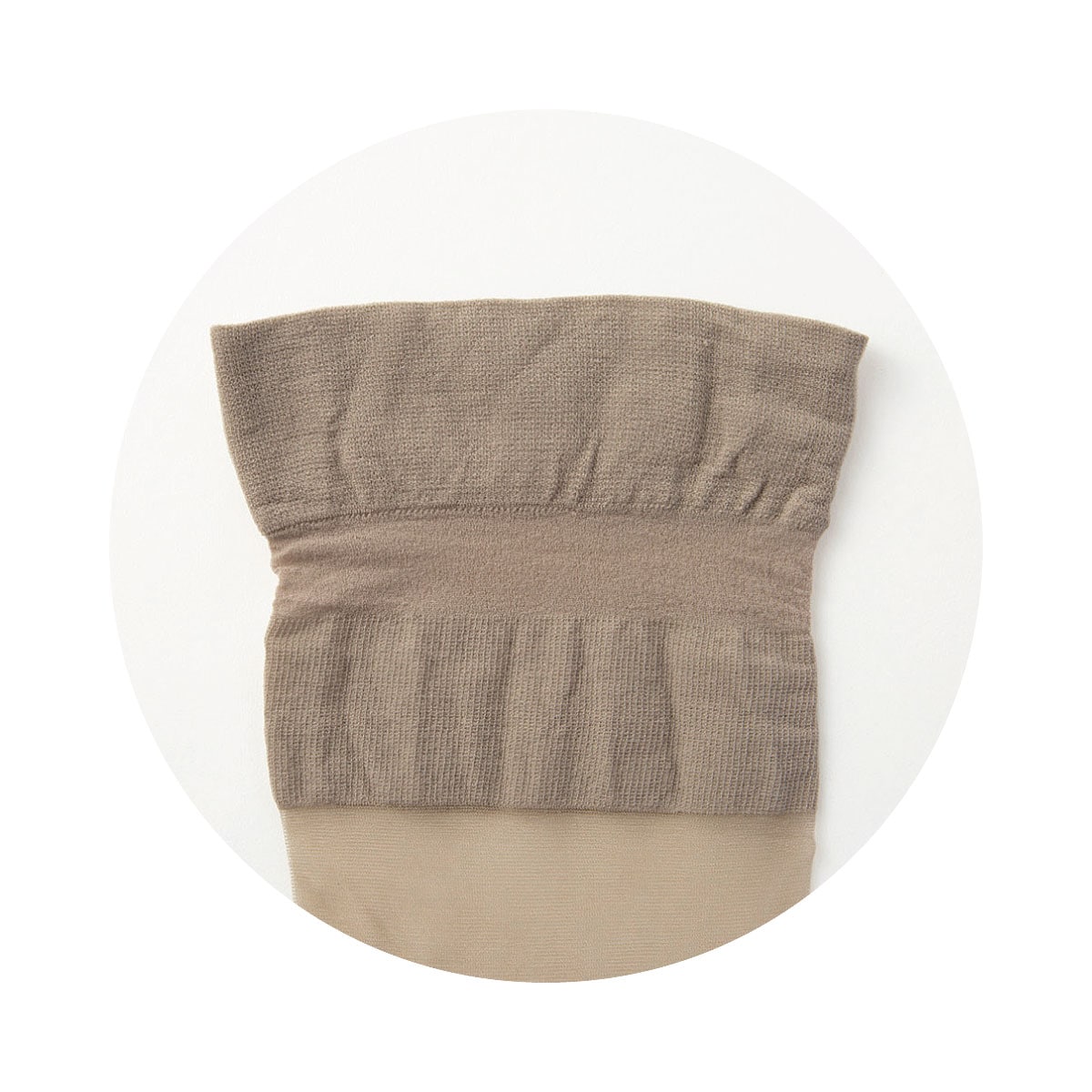 パンティ部のムレや締め付けが苦手な方におすすめ。ズリ落ちにくいはき口のロング丈ストッキング。 チャームベージュ(同色5足組)着用例