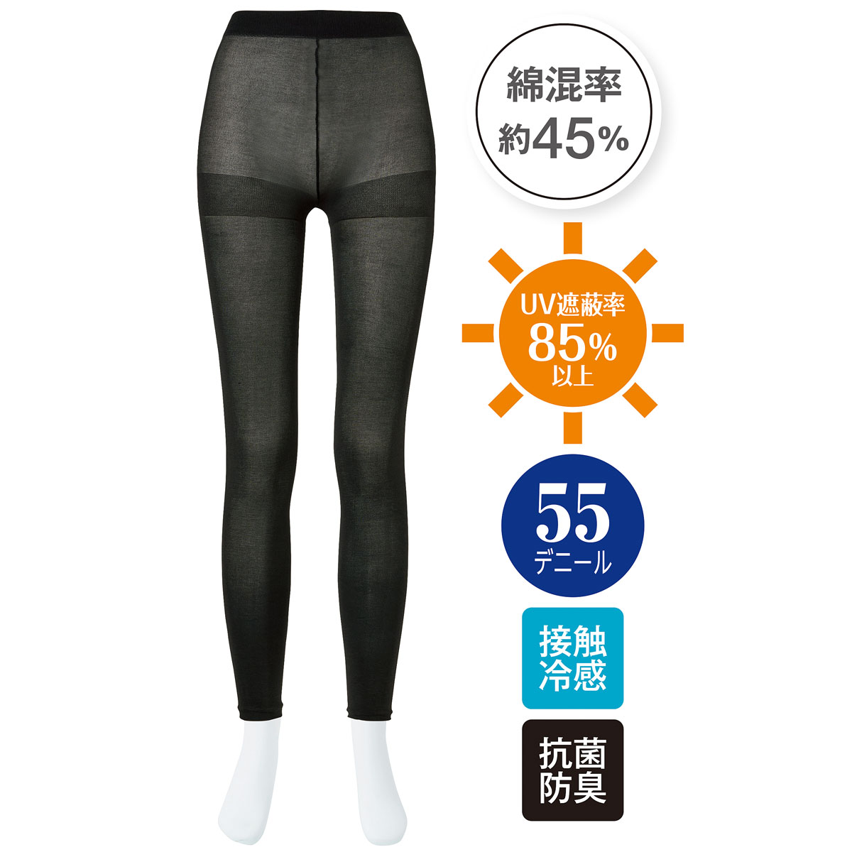 さらっと薄手で履いた瞬間ヒンヤリ感のある(接触冷感)、綿混のストッキングレギンス。杢調のやさしい色味です。ウエスト・ヒップはゆったり感のある寸法設定で、ラクな履き心地にこだわりました。抗菌防臭、UV遮へい率85%以上で暑い時期を中心に長い期間ご使用いただけます。信頼の日本製。