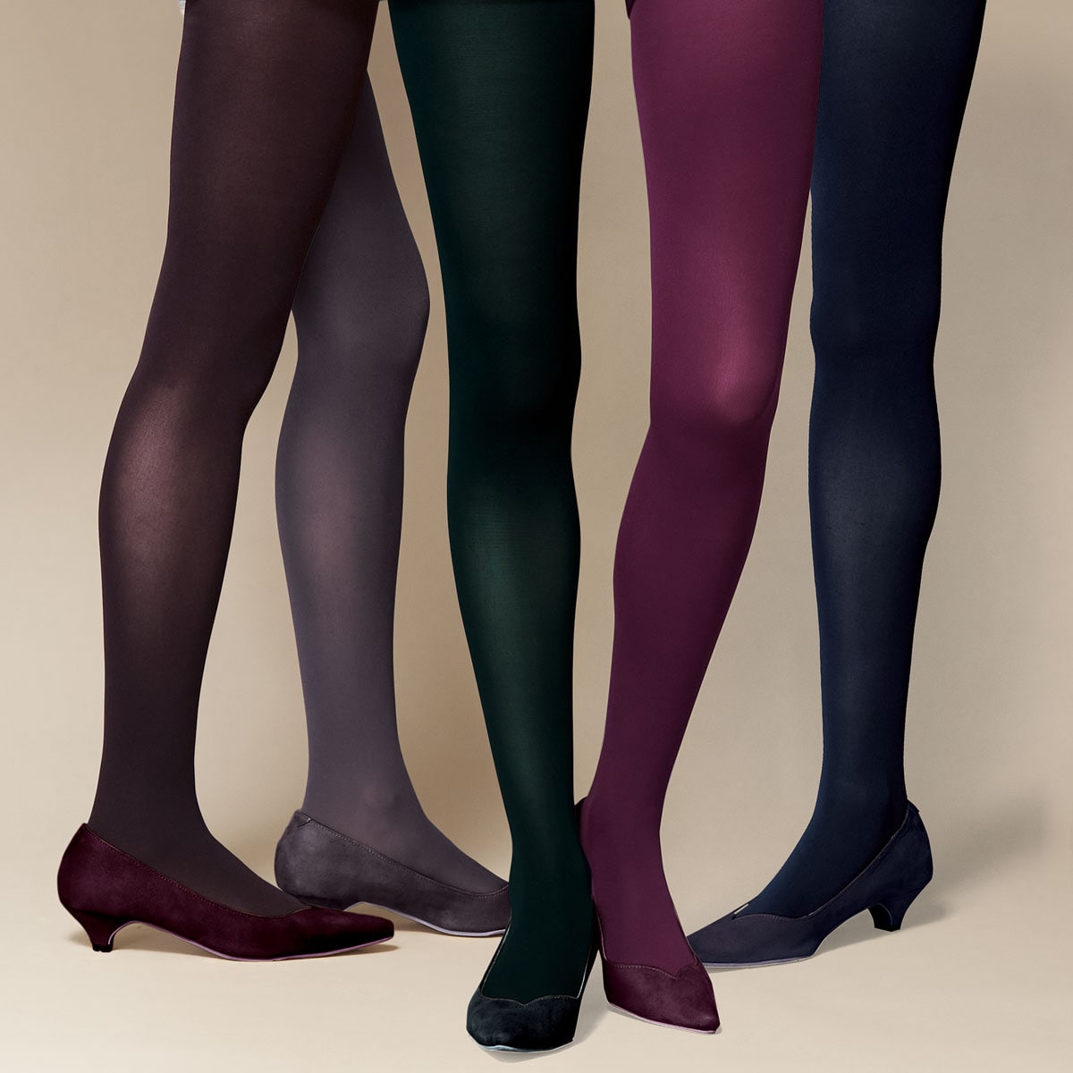 ニュアンスカラーで手軽に印象チェンジ!80デニールタイツ(左から)ブラウン、バイオレットグレー、A(グリーンブラック)、ダークワイン、ミッドナイトブルー