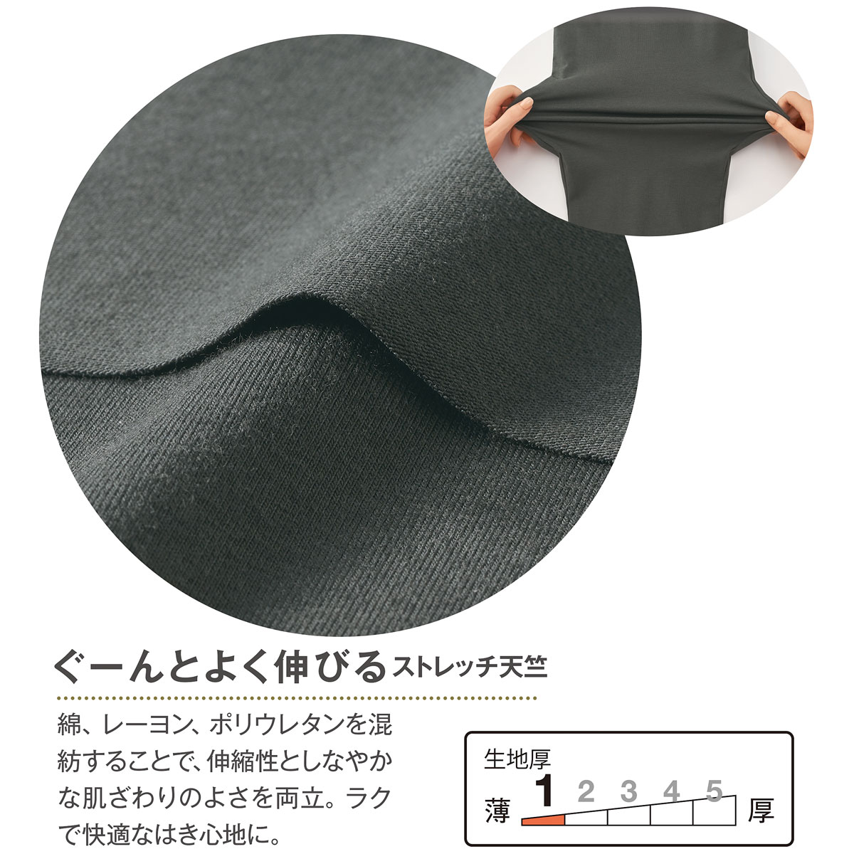 ■[ニット]綿48%レーヨン47%ポリウレタン5%(ストレッチ天竺)●左右ポケット●中国製【綿混】 【ウエストゴム取替OK】 【大きいサイズも展開】(M~5L)【生地厚指数1】