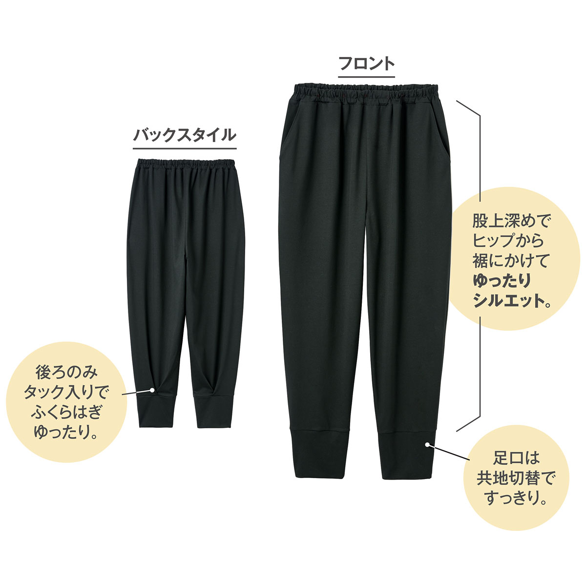 【家でも外でも恥ずかしくない、とことんラクなパンツを作りました!】ぐーんとよく伸びるストレッチ天竺素材でつっぱりにくく快適な履き心地♪ヒップから裾にかけてゆったりシルエットで心地よく、足口は切り替えですっきり見え。家事にぴったりな「家事ラクパンツ」
