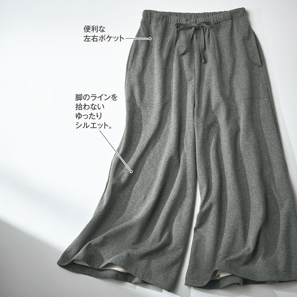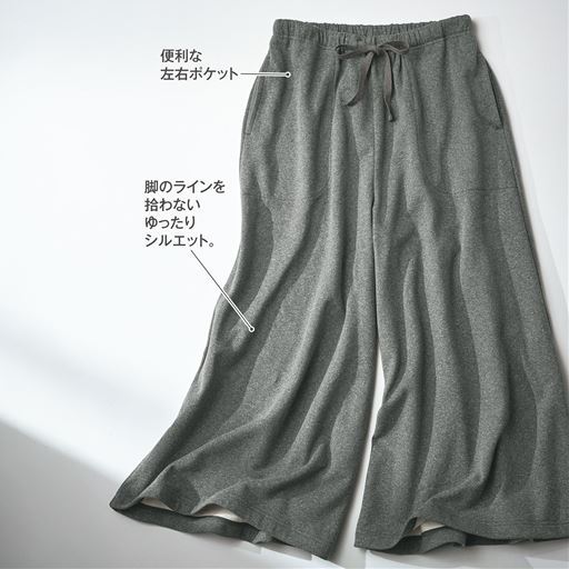 両面起毛のもちもちとした肌触りが気持ちいい、ゆったりシルエットで体系カバーも叶うガウチョパンツ。(ルームウェア)