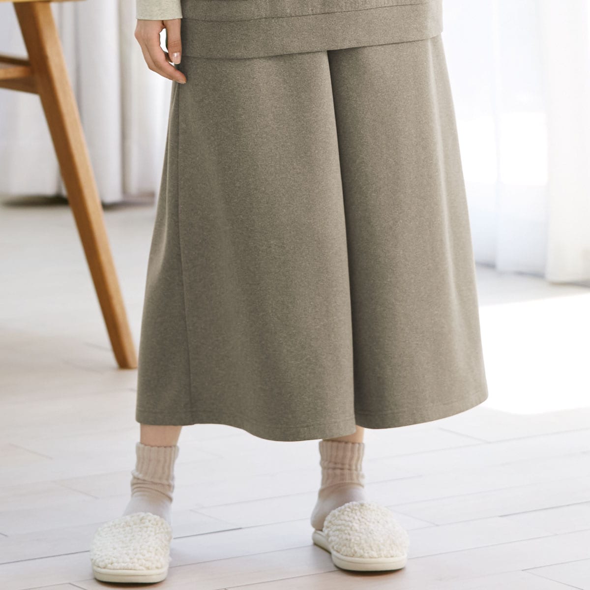 両面起毛のもちもちとした肌触りが気持ちいい、ゆったりシルエットで体系カバーも叶うガウチョパンツ。(ルームウェア)