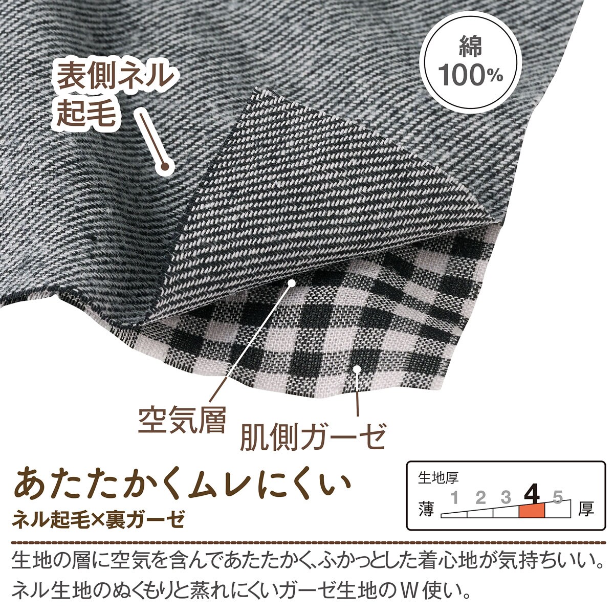 生地はあたたかくムレにくい、表側ネル起毛×裏側ガーゼのW使い。生地の層に空気を含んであたたかく、ふかっとした着心地が心地いい。ぬくもりを感じる表起毛の素材感も◎デザインはころんとしたシルエットのバルーンパンツでゆったりかわいい。裾はタック入りですっきり。シンプルで着回しやすい色がうれしい。裏側は小さなギンガムチェックで見えないところまでかわいく♪ウエストゴムは2本通しでお腹を締め付けにくく、肌あたりやさしくフィット。ゴム取替口もあります。大きいサイズまで展開(M~3L)