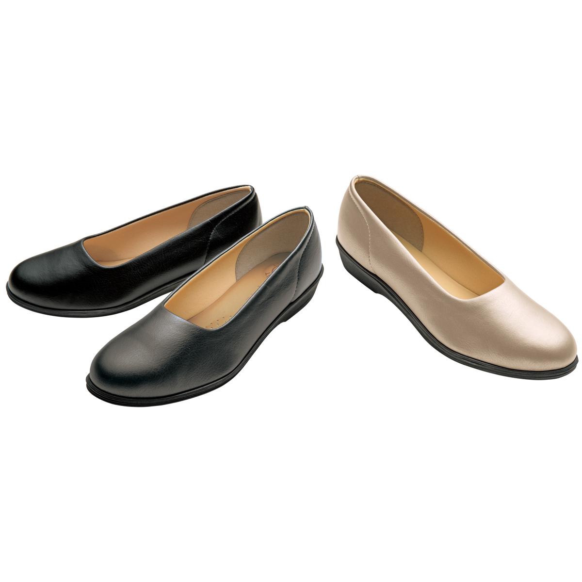 ー素材特性ー甲材のサイドに伸縮性のある素材を使用して足への圧迫を軽減し、長時間履いても痛くなりにくく快適。ソールは返りがよく歩きやすい。3つのパッドが足裏に優しくフィットする中敷は無機抗菌剤ZEOMICを施した「Agライニング」を使用し、銀イオンパワーで抗菌。【抗菌(中敷)】■素材/[甲材]合成皮革 [底材]合成底 ■ヒール高/約2.5cm ■重量/約120g(23cm片足) ■ワイズ3E相当●日本製※靴の試し履きは必ず室内でお願いします。一度ご使用になられた靴の交換・返品は承れません。※雨の日や水に濡れた路面・床面でご使用の場合には、スリップや転倒の危険がありますので、歩行の際には十分ご注意ください。