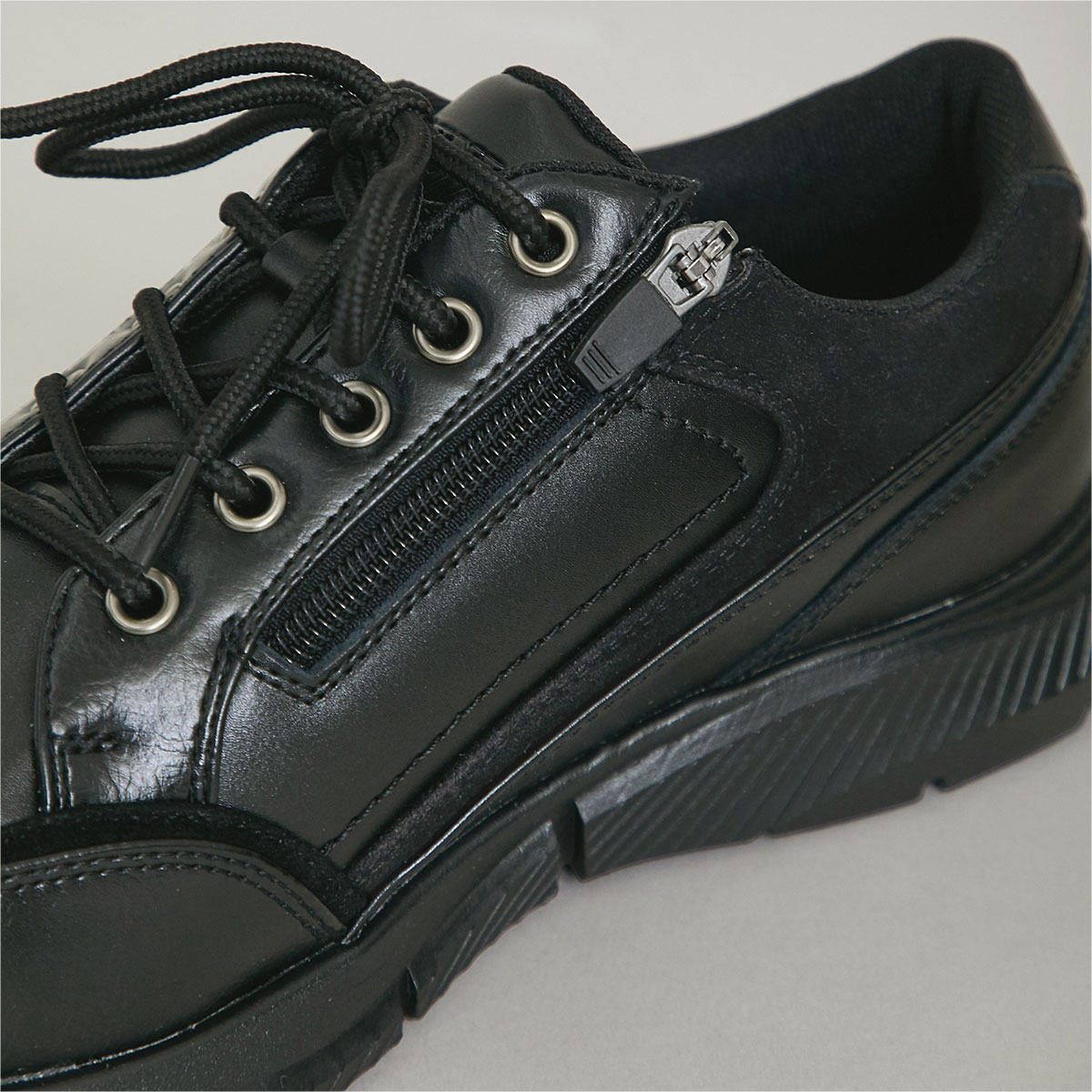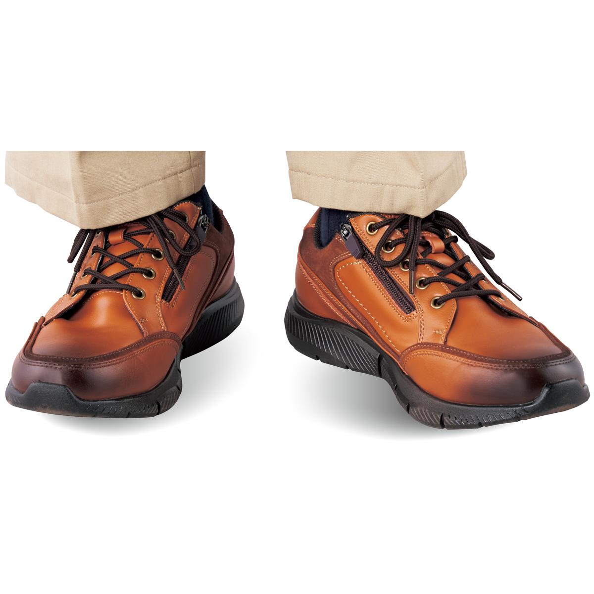 -お買い得ポイント-スタイリッシュなデザインシューズで、防水仕様なので履きやすい。-デザイン-タテにゆとりをもたせた足囲5Eで、甲高の足にもラクにフィット。甲高にこだわったゆったり5Eワイズ。内側には着脱しやすいロングファスナー。-素材特徴-静止状態で、ソール部からアッパー部にかけて4cmの部位が4時間の防水仕様。