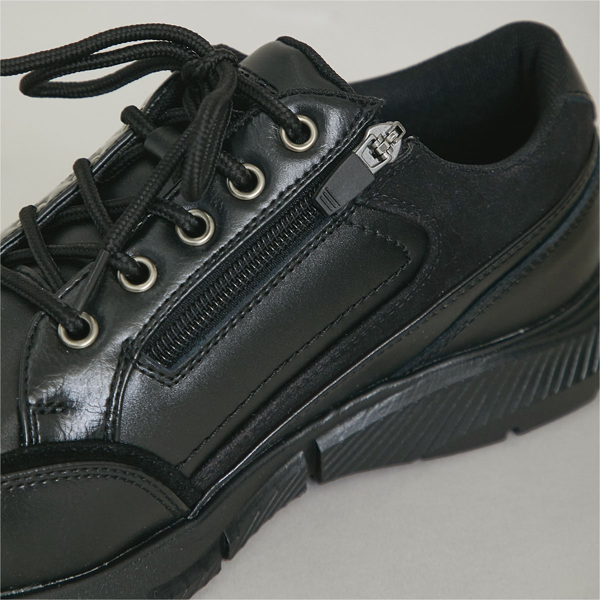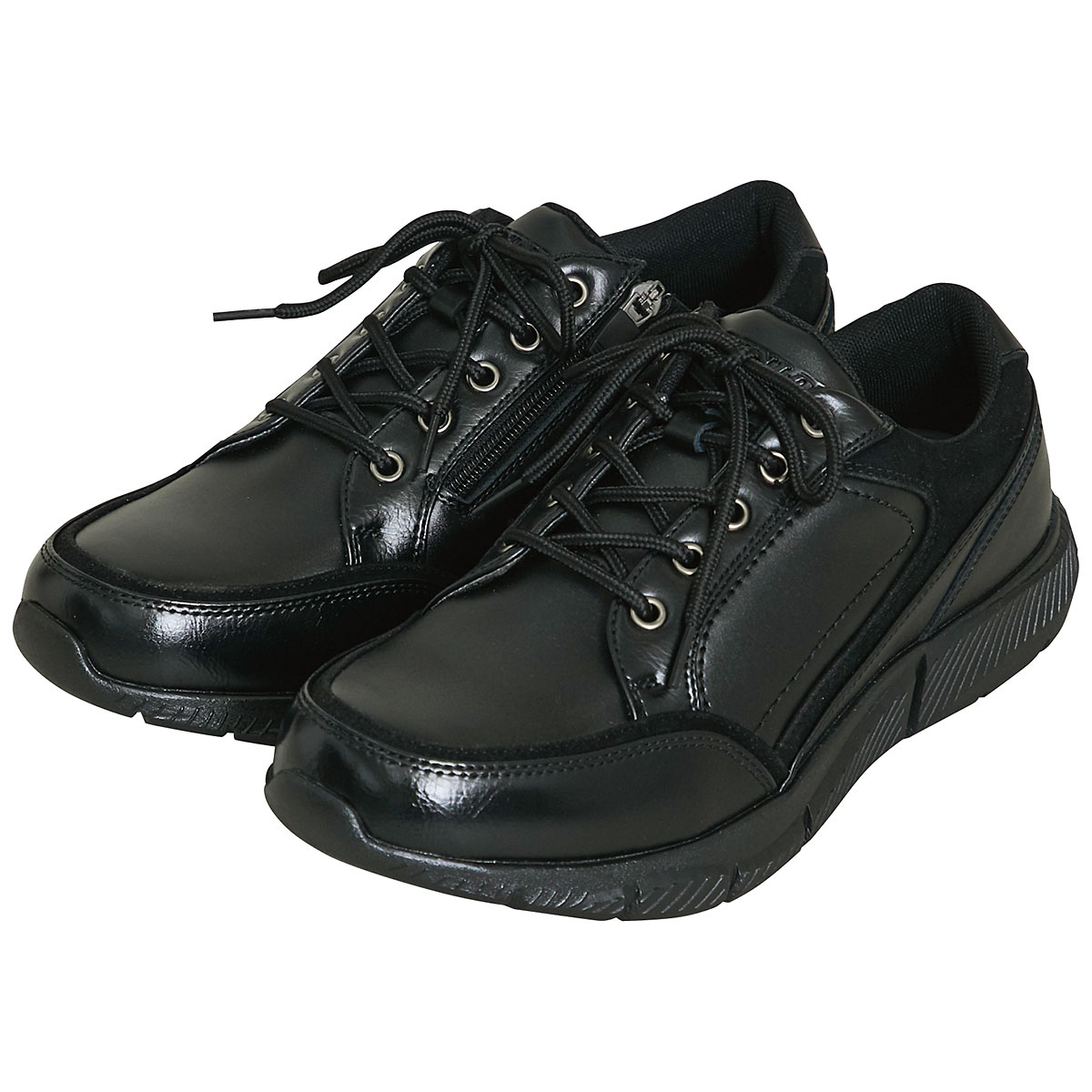 -お買い得ポイント-スタイリッシュなデザインシューズで、防水仕様なので履きやすい。-デザイン-タテにゆとりをもたせた足囲5Eで、甲高の足にもラクにフィット。甲高にこだわったゆったり5Eワイズ。内側には着脱しやすいロングファスナー。-素材特徴-静止状態で、ソール部からアッパー部にかけて4cmの部位が4時間の防水仕様。