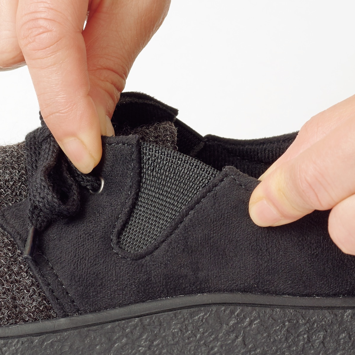 履き口の両サイドにゴム素材を使用。足の動きにフィットし、脱ぎ履きも簡単です。(※画像は同シリーズの別商品です。※共通機能)