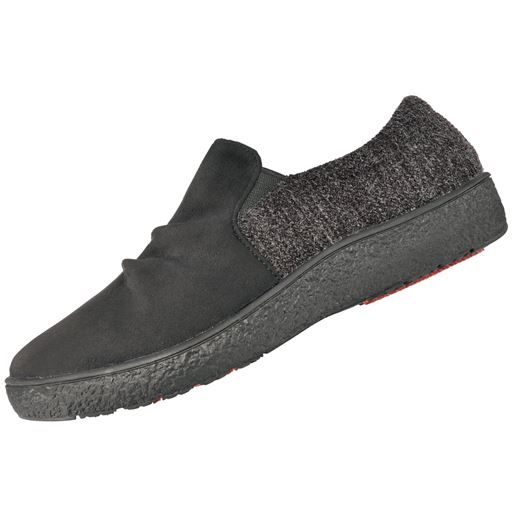 履き口の両サイドにゴム素材を使用。足の動きにフィットし、脱ぎ履きも簡単です。(※画像は同シリーズの別商品です。※共通機能)