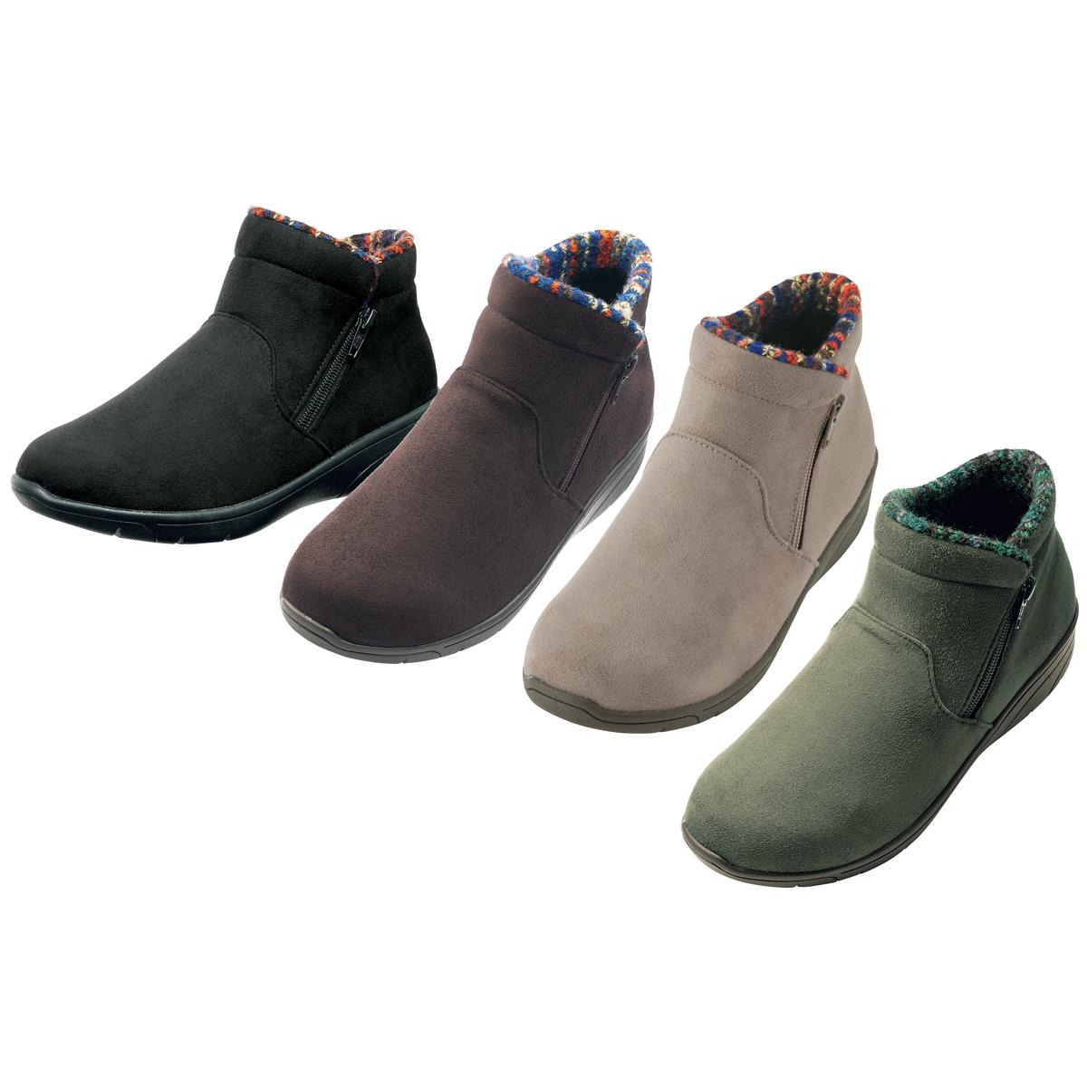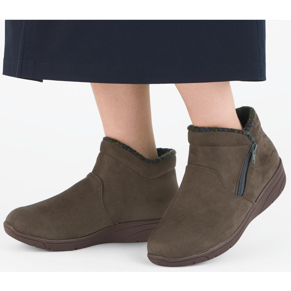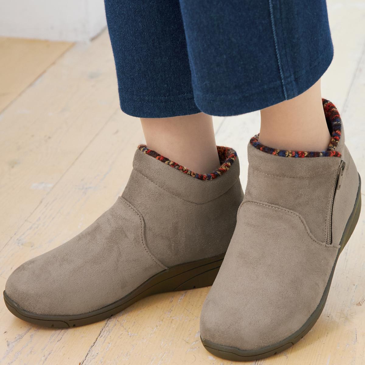 生活防水設計で雨の浸入を防ぐ、ゆったり4E相当で履きやすいショートブーツ。ファスナー付きで脱ぎ履き簡単。中敷は抗菌防臭加工でニオイ対策も。ーデザインーあたたかみのあるスエード調の素材に、チラリと覗く履き口のニット素材がシックな秋冬コーデのアクセントに。ー素材特徴ー中敷の下に配した断熱性シート「ミラマット」が地面からの冷気をブロックし、靴内部の空気をあたたかく保ちます。【はっ水】 【抗菌防臭】(中敷)
