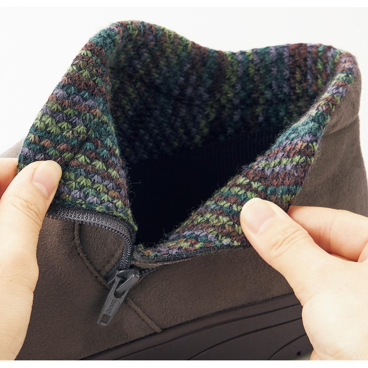 カーキ履き口のマルチカラーニットがアクセント。ファスナー付きで脱ぎ履き簡単。