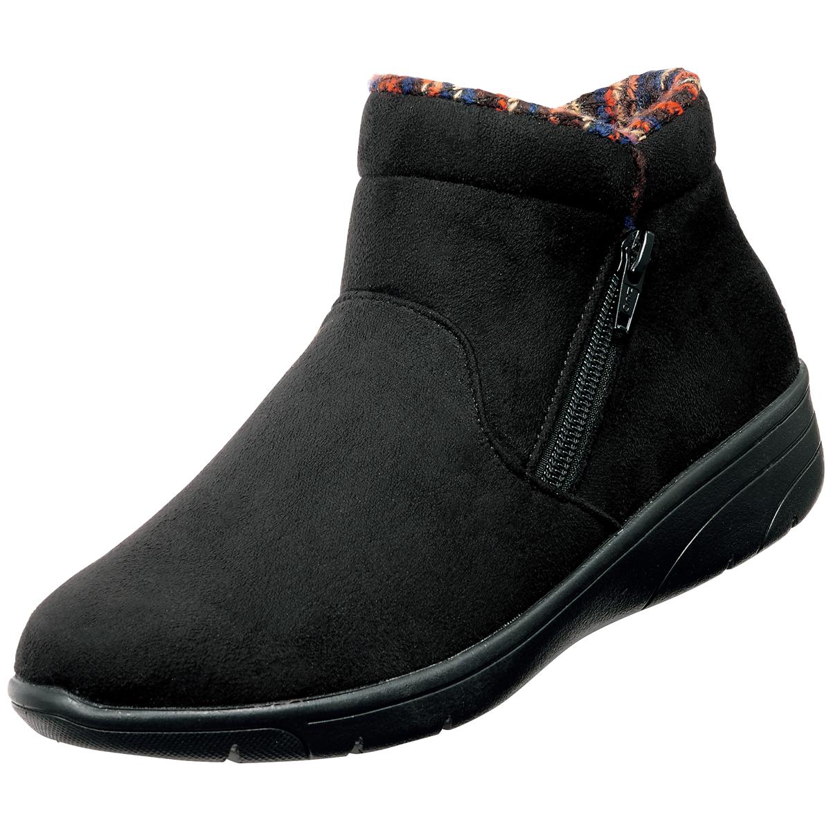 生活防水設計で雨の浸入を防ぐ、ゆったり4E相当で履きやすいショートブーツ。ファスナー付きで脱ぎ履き簡単。中敷は抗菌防臭加工でニオイ対策も。ーデザインーあたたかみのあるスエード調の素材に、チラリと覗く履き口のニット素材がシックな秋冬コーデのアクセントに。ー素材特徴ー中敷の下に配した断熱性シート「ミラマット」が地面からの冷気をブロックし、靴内部の空気をあたたかく保ちます。【はっ水】 【抗菌防臭】(中敷)