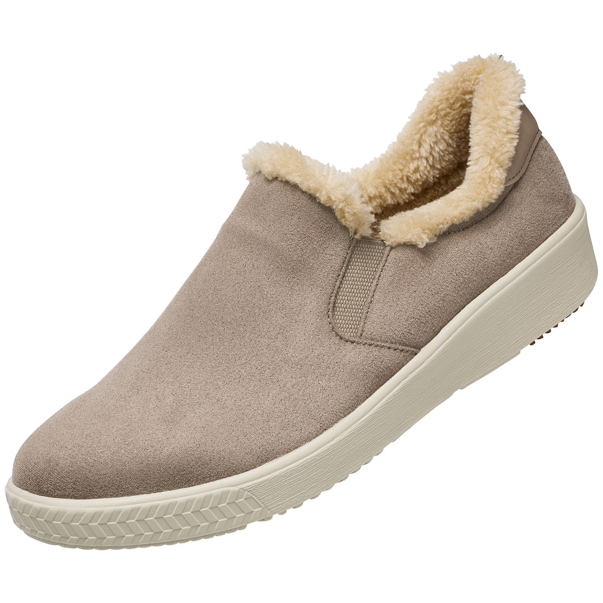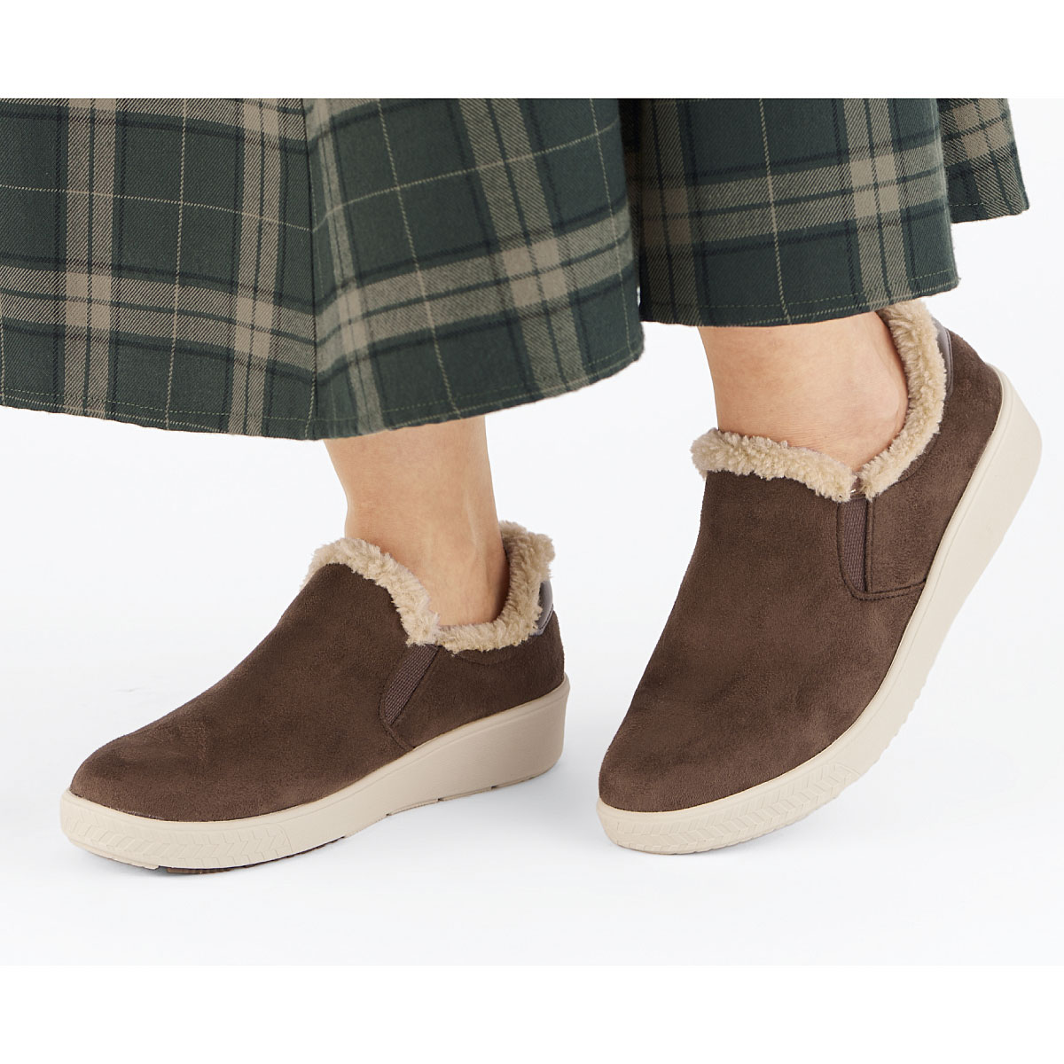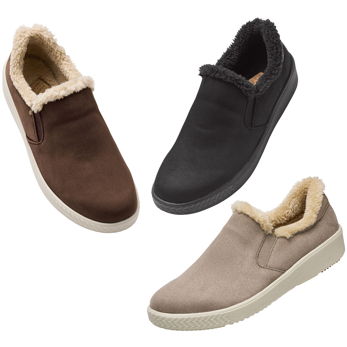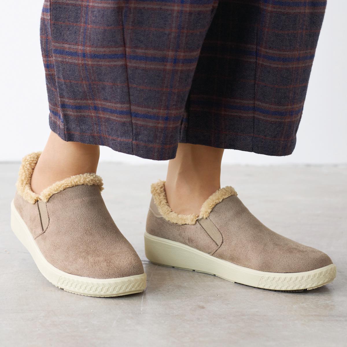 たっぷり使用したボア調素材のぬくもりがうれしい、見た目にも冬を楽しめるスリッポン。足を包み込むようにフィットします。ーデザインー履き口両サイドに伸縮するゴムを使用し脱ぎ履きもスムーズ。ー素材特性ースエード調生地部分ははっ水加工を施しています。【はっ水】【軽量約140g(23cm片足)】