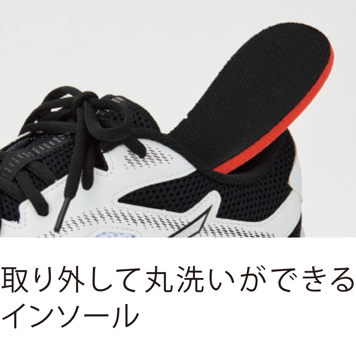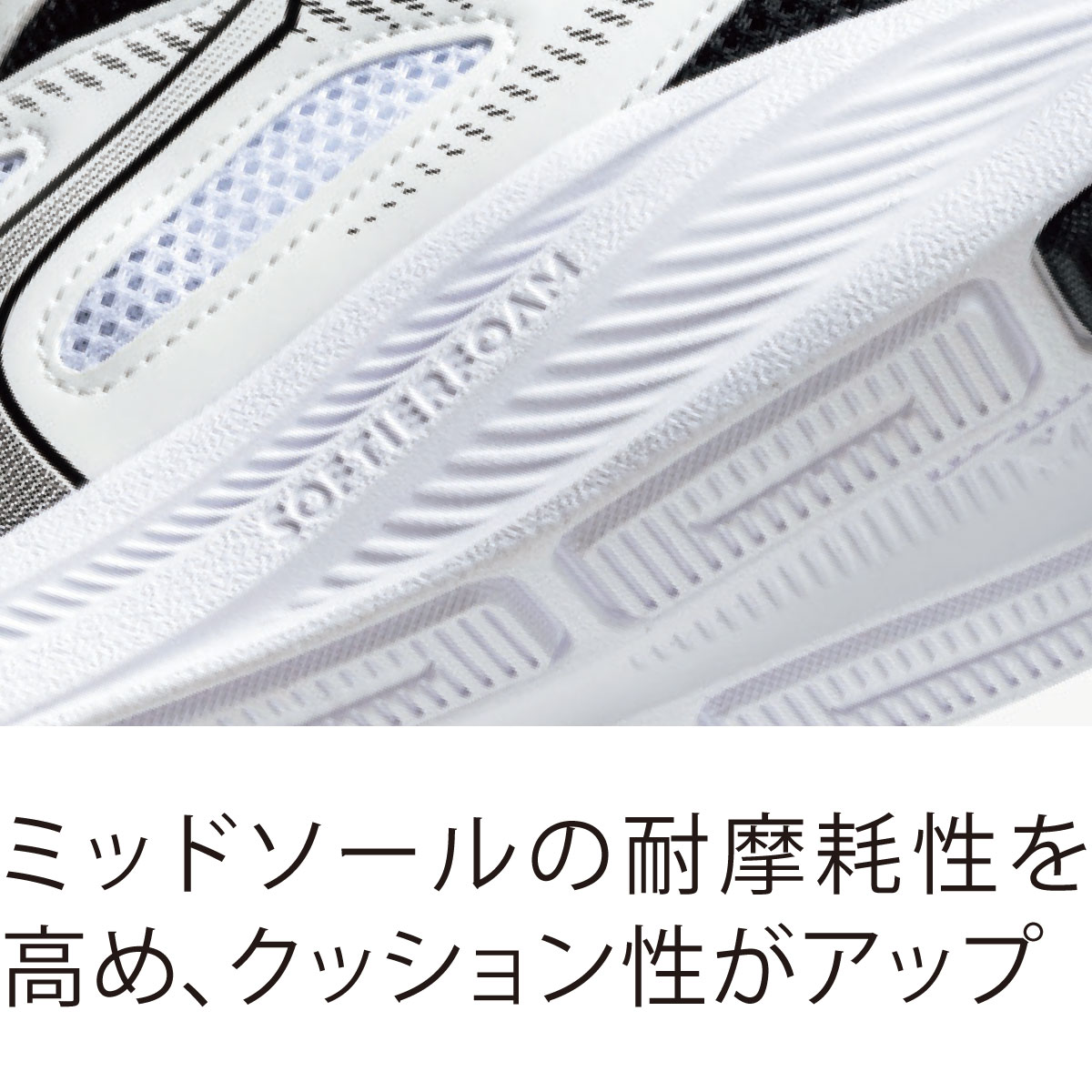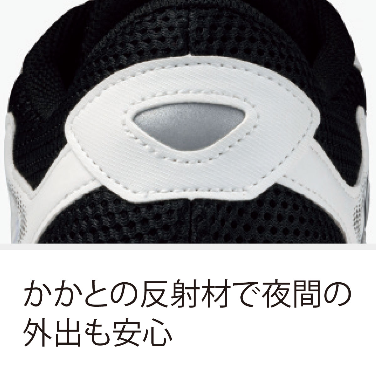 反射材付きで夜の外出も安心。リニューアル!クッション性をさらに高めるため、摩耗しやすい部分にアウトソールを配置。ミッドソールの耐摩耗性も強化。