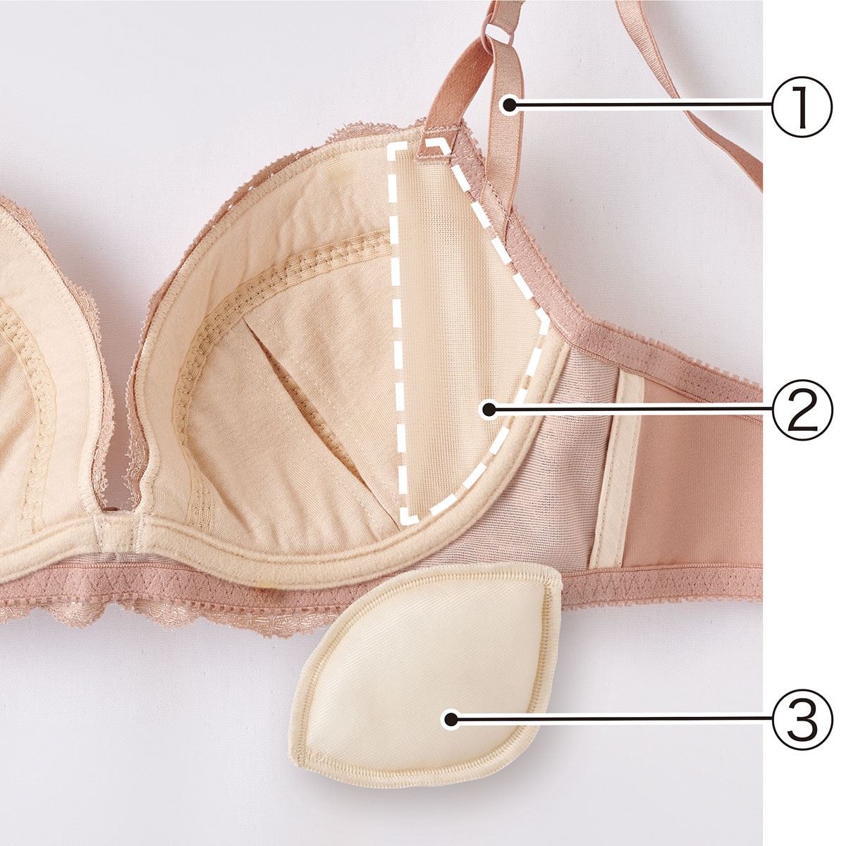 ①バストを寄せて上げるクロスストラップ。動きにもフィット。②バストをさらに寄せて谷間をつくるリフトアップパネル。③バストをぐっと寄せるプッシュアップパッド付き。