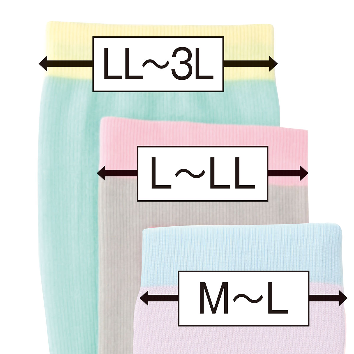 M~L:はき口裏側はライン無しL~LL:はき口裏側に1本ライン入りLL~3L:はき口裏側に2本ライン入り
