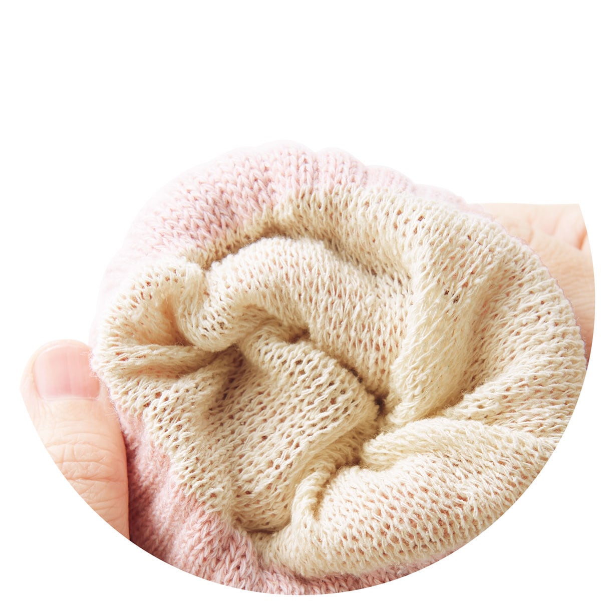 伸縮性のよいリブ編み仕立てで、ピタッとフィット。足首やふくらはぎの冷え対策に。 ピンク着用例
