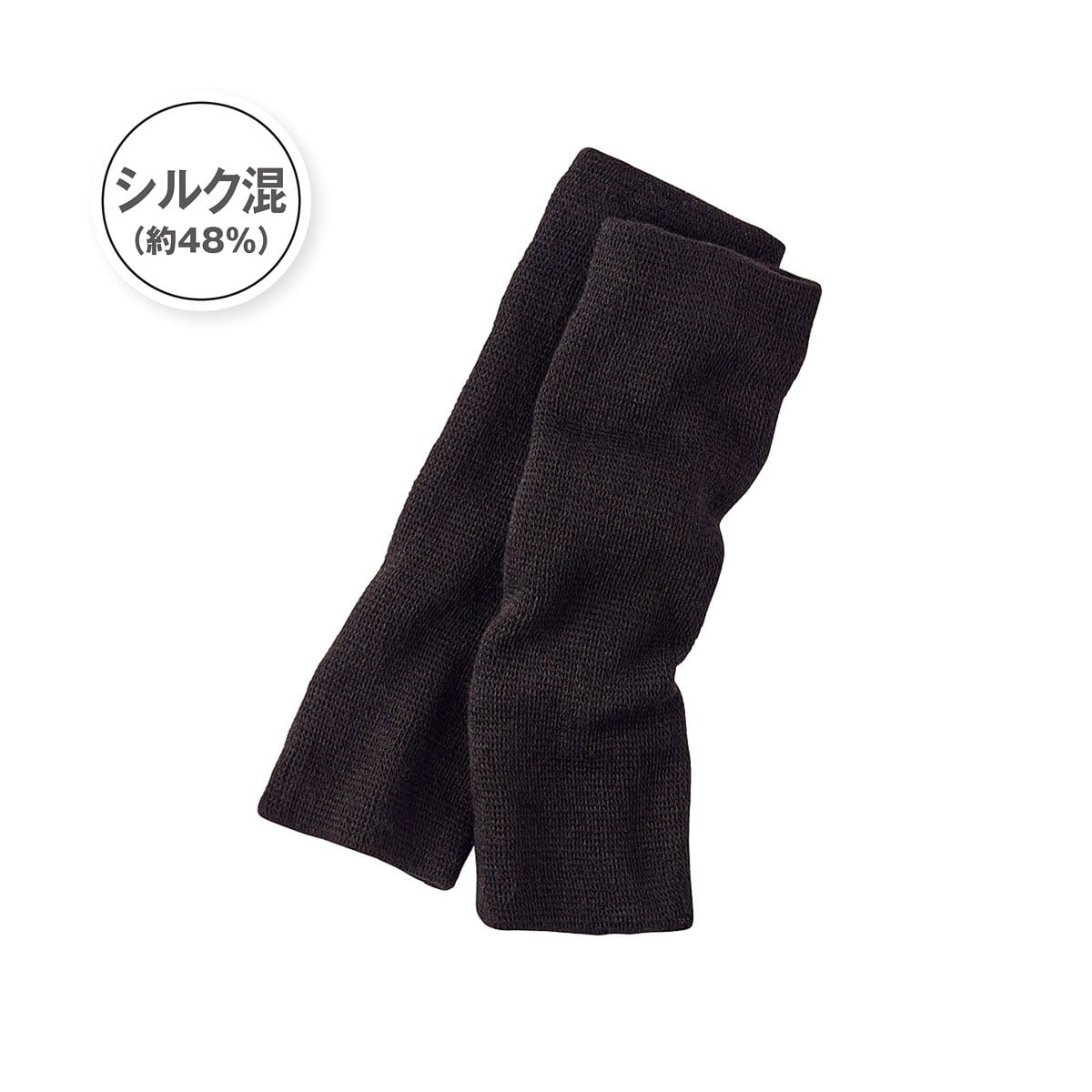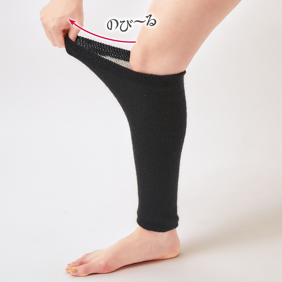 肌側は、綿に近い素朴な風合いのシルク混素材。履き口だけでなく全体的に伸縮性に優れたレッグウォーマーで、窮屈感なく着用いただけます。