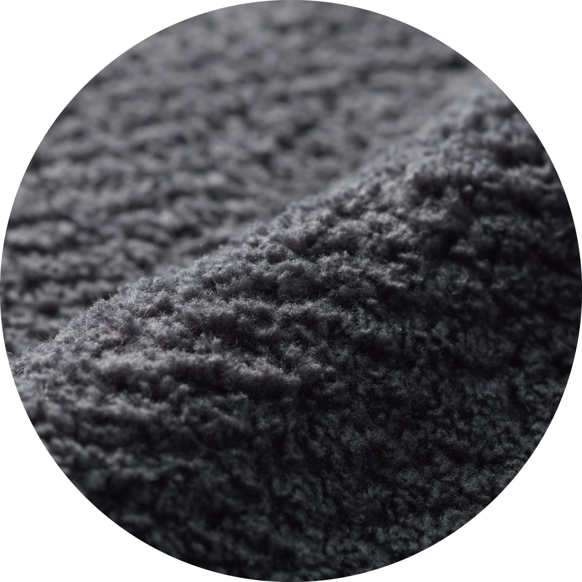 表情のある表面のフリース素材を使用した、あたたかなチュニックベストです。肩先までカバーするデザイン。お尻まで隠れるロングタイプ。フワフワとした風合いで肌触りがやさしくリラックスタイムにおススメ。左右にポケット付き。立ち衿仕様で首もともあたたか。