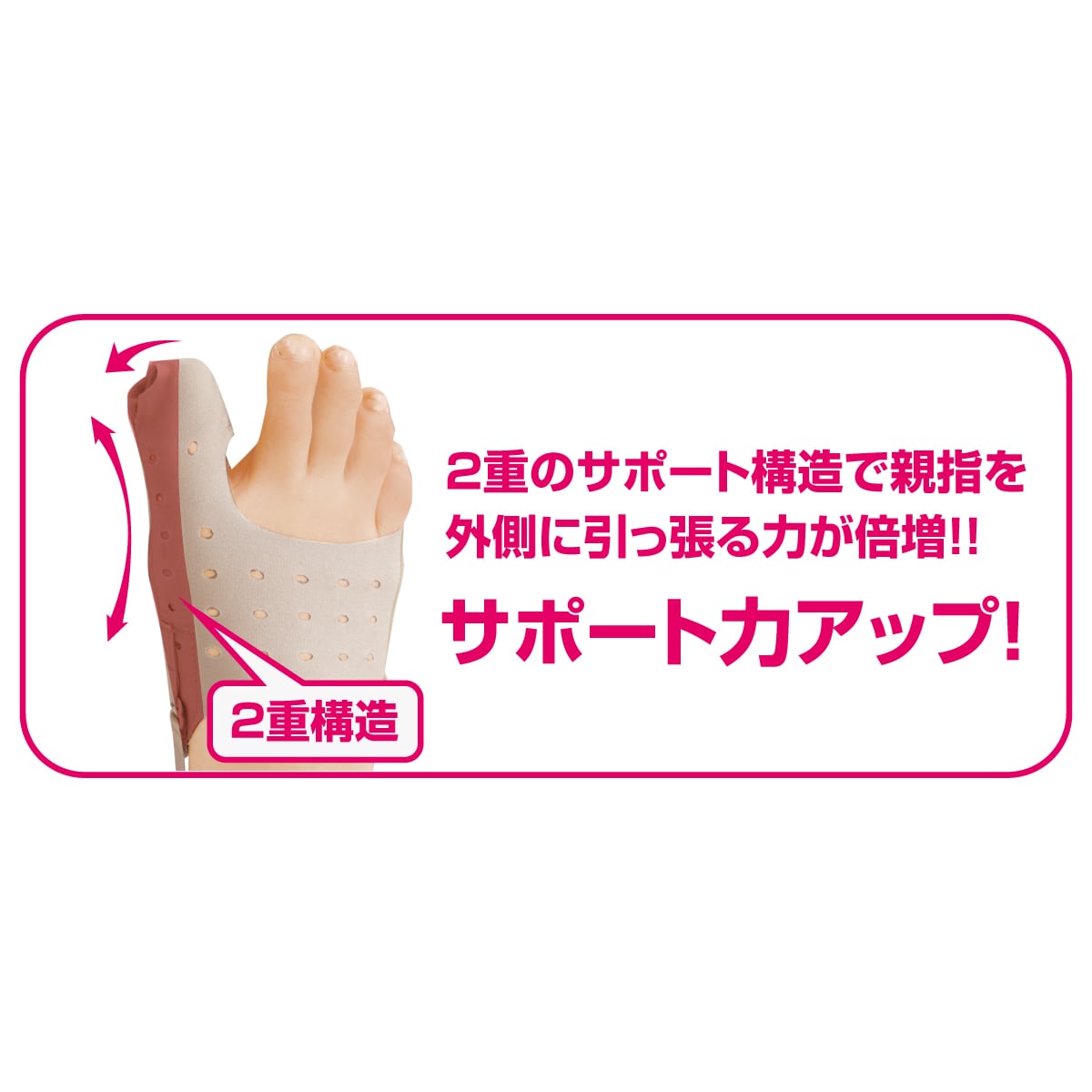 二重のサポート構造で親指を外側に引っ張る。(メーカー従来品比)(※着用効果には個人差があります。)