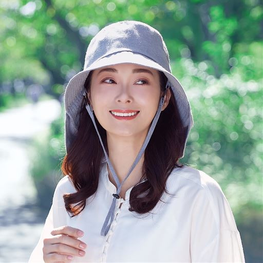 さわやかなシャンブレー生地を使用した日よけ対策帽子。 ブルー着用例
