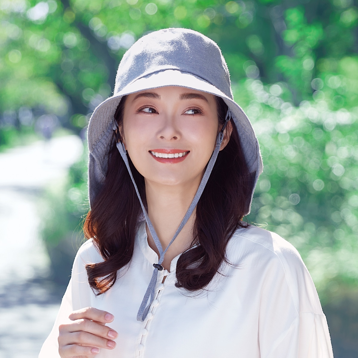 日よけシェードはボタンを留めるとリボン風になり、シーンに合わせてコンパクトに畳んで被ることもできます。