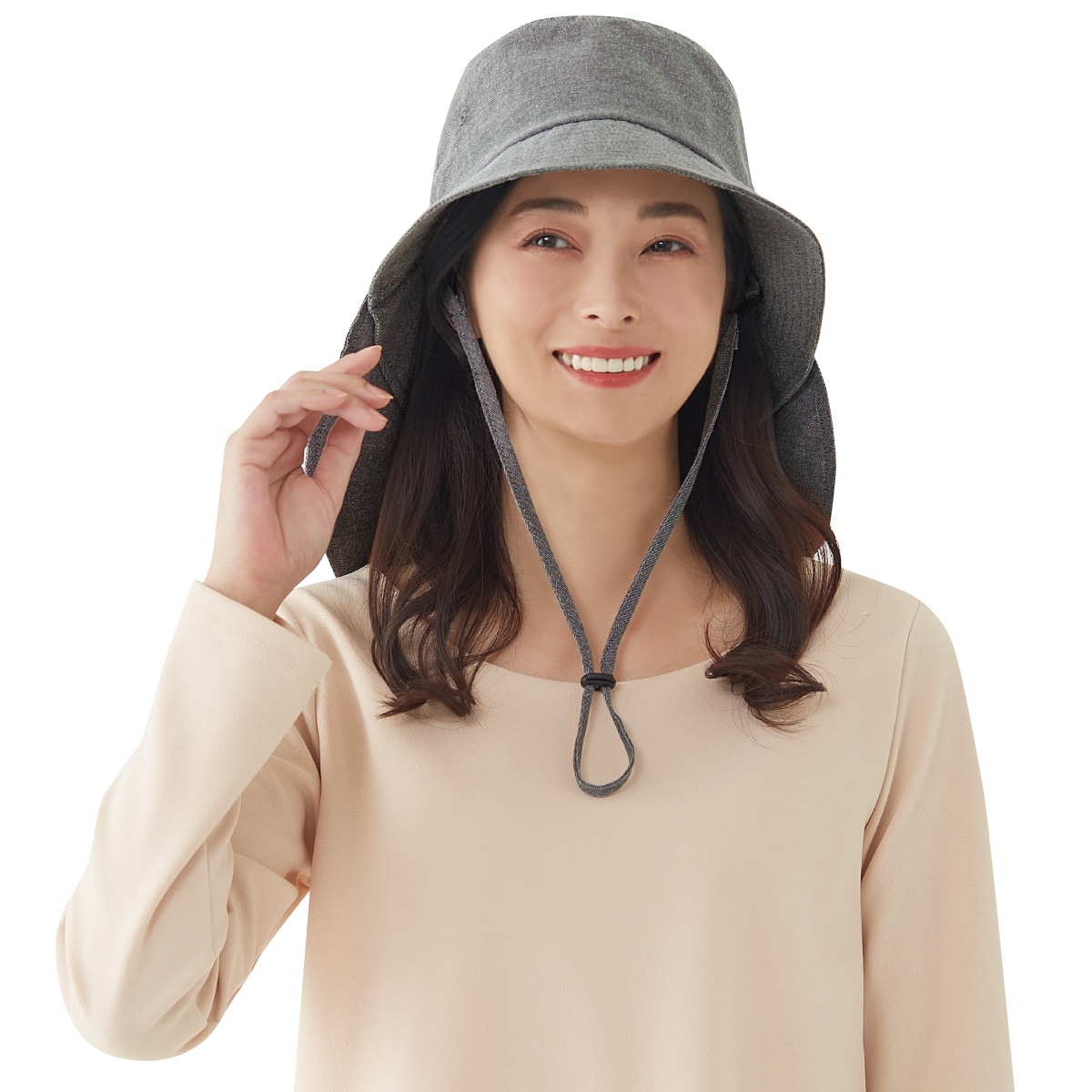 さわやかなシャンブレー生地の日よけ対策帽子。