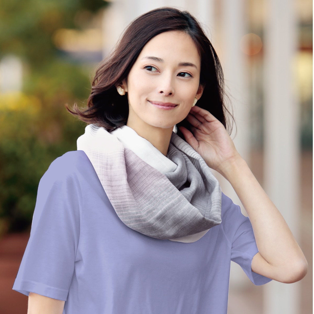 サッと巻いて首まわりのカバーや日よけ対策も。落ち着きのあるお洒落な先染めグラデーションカラーです。 (グレー系着用例)