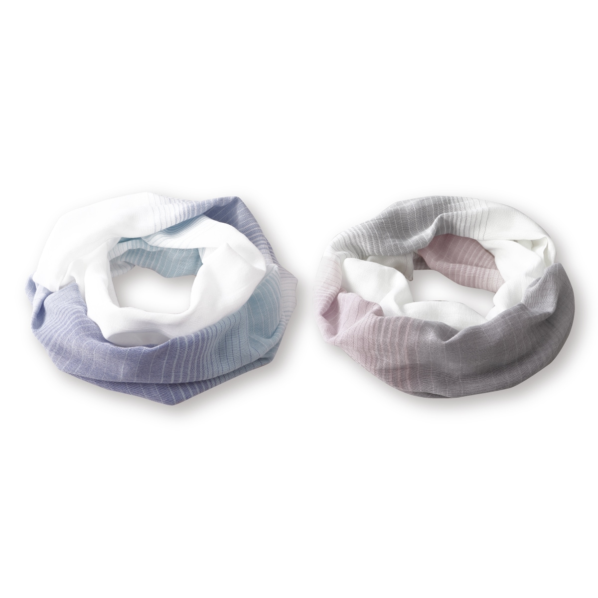綿100%ふんわりガーゼのお洒落スヌード。ブルー系とグレー系の2色組です。