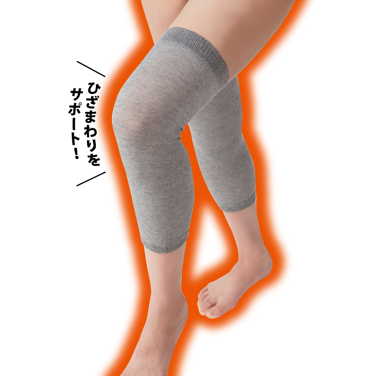 備長炭の練り込み繊維を使用。内側にはシルク素材を使用し、肌あたりよくふんわりと温めます。上下の足口部分はリブ編みになっているので、着用時にぴったりフィットしてズレにくい。伸縮性に優れた素材で締め付けすぎずに、ひざまわりをサポートします。