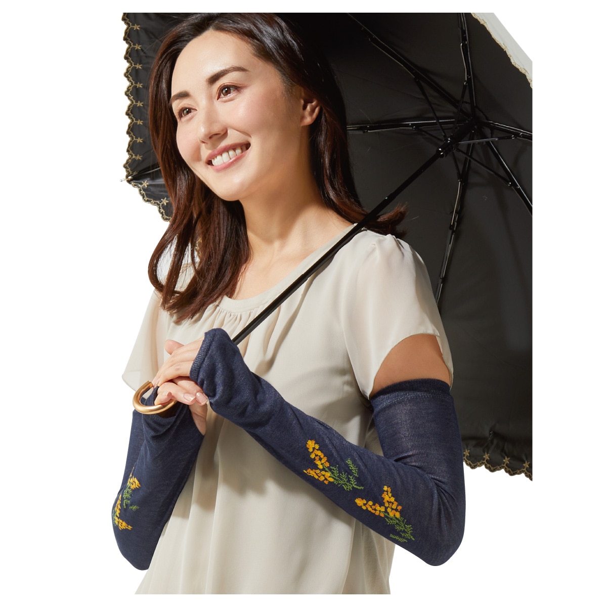 • お出かけが楽しくなるかわいい花柄のUV対策アームカバー。 ネイビー着用例