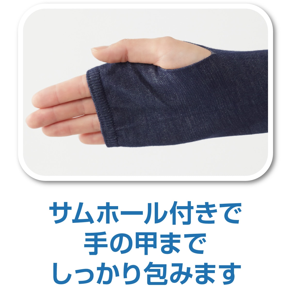 • サムホール付きで手の甲までしっかり包みます。