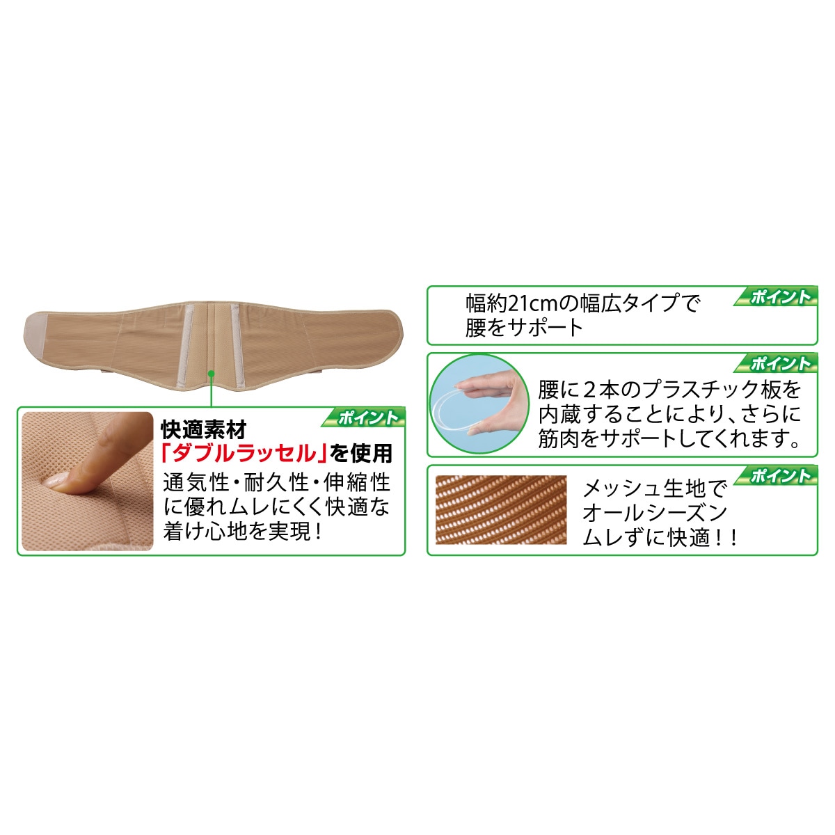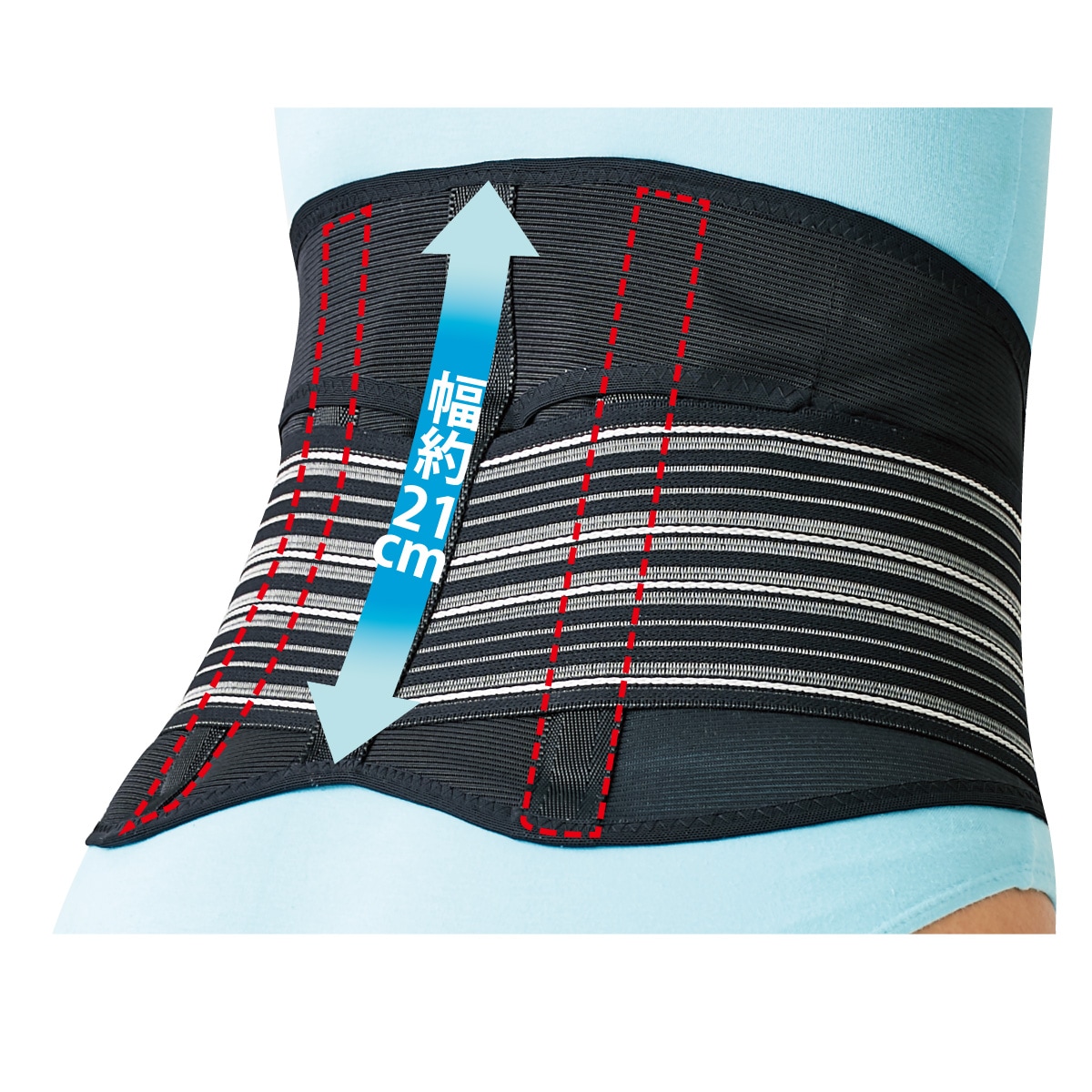 やわらかくて薄い生地を使用しているから、家事や仕事中でも目立ちにくく快適にご使用いただけます。こだわりの設計でお腹を支えている筋肉をサポートし、お腹に力が入りやすく、背面中心部は幅約21cmの幅広タイプで、腰まわりをしっかりサポートするコルセット。メッシュ素材でムレにくく、2重のベルトはマジックテープ®でカンタンに装着できます。
